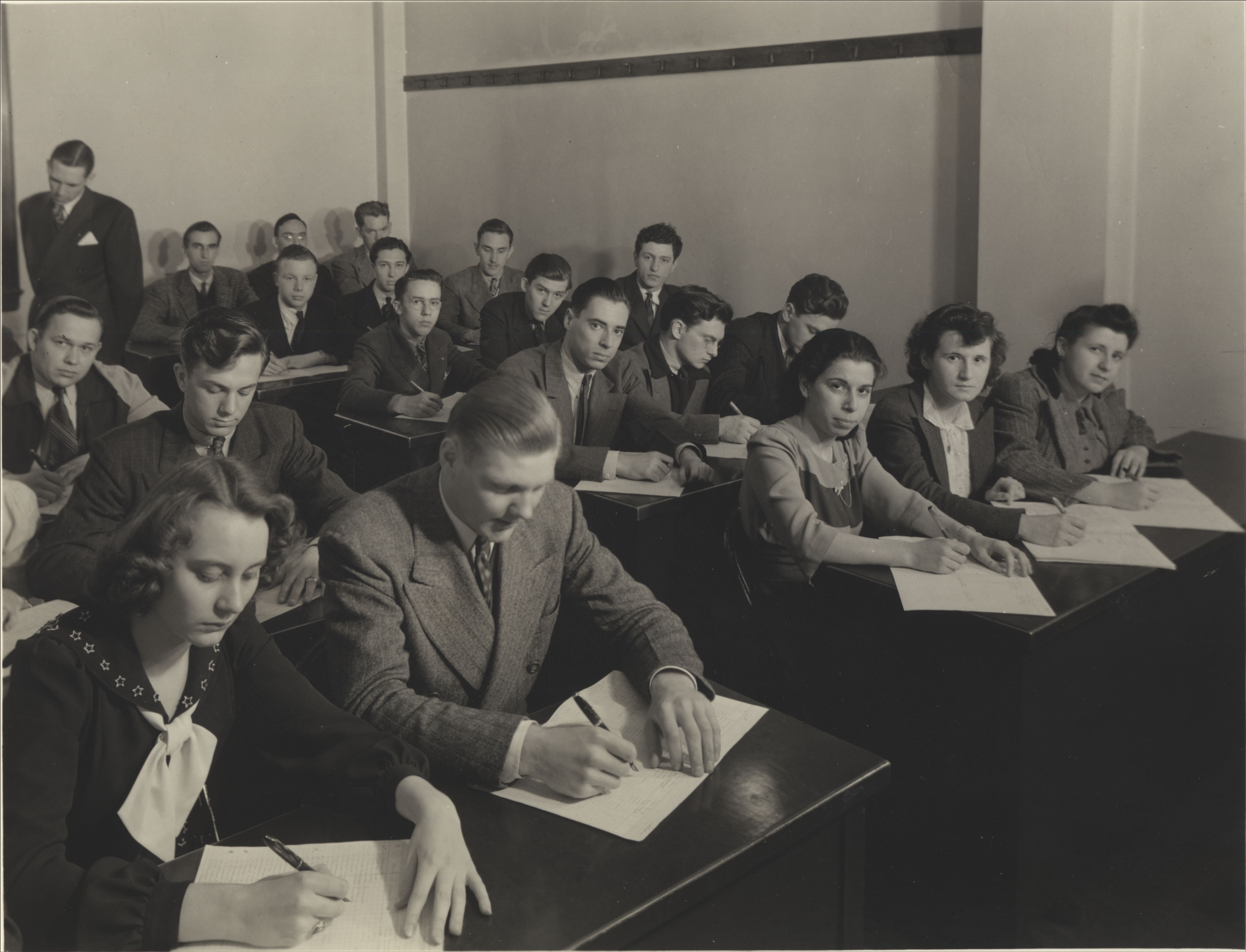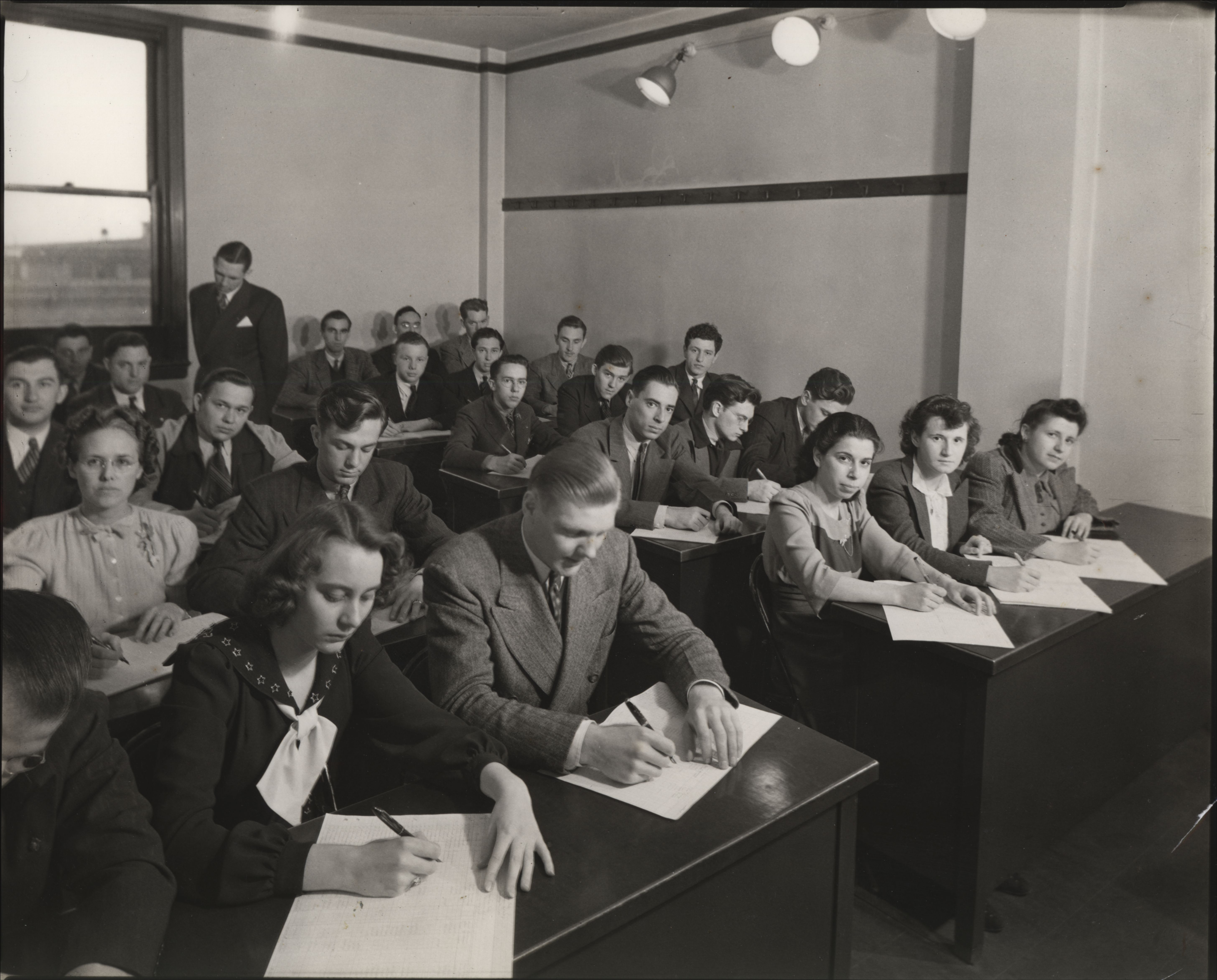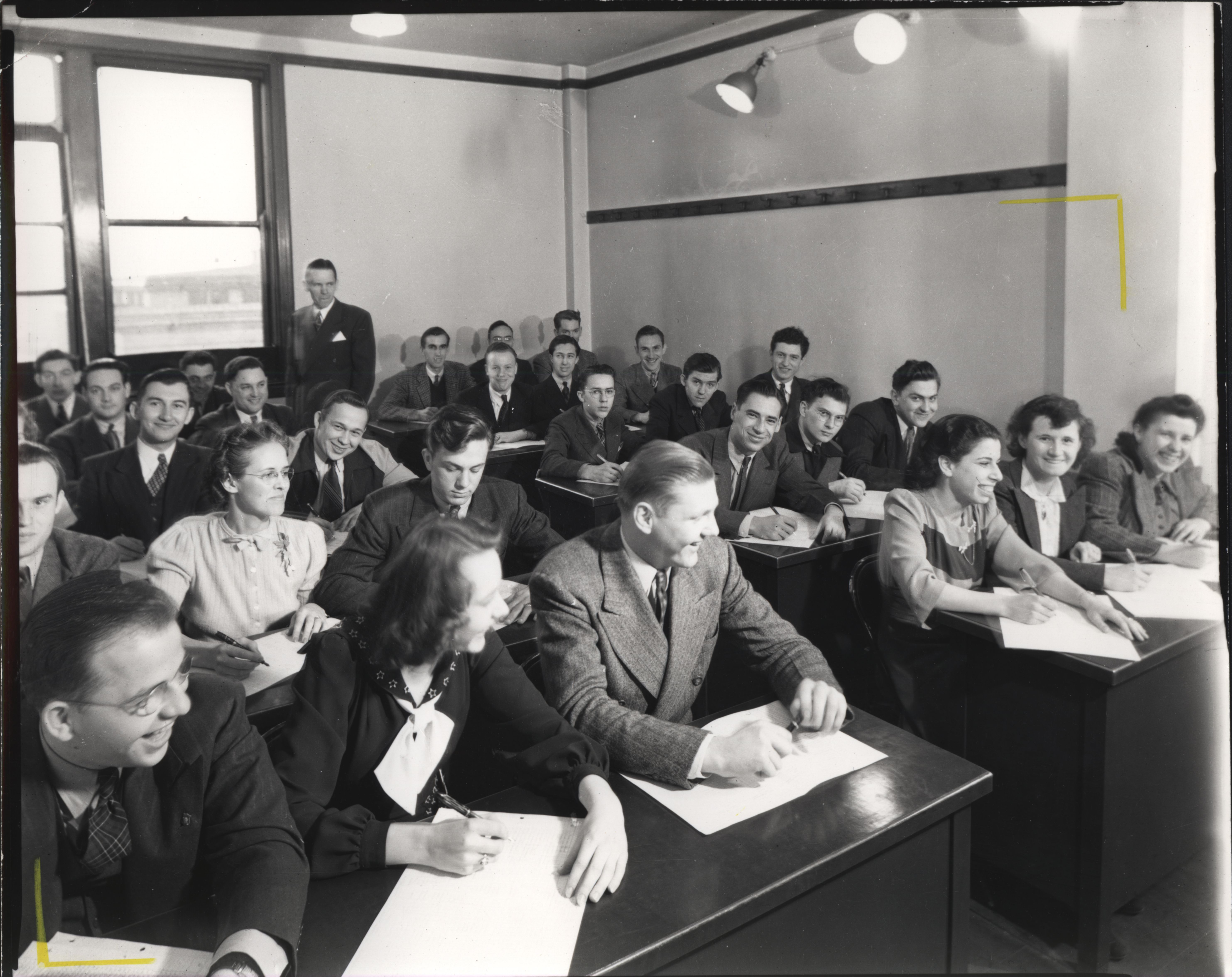 During WWII, Gerald Schroeder '38, (standing in back of room) teaches a day class at Walsh that includes several women. (from back of photo)