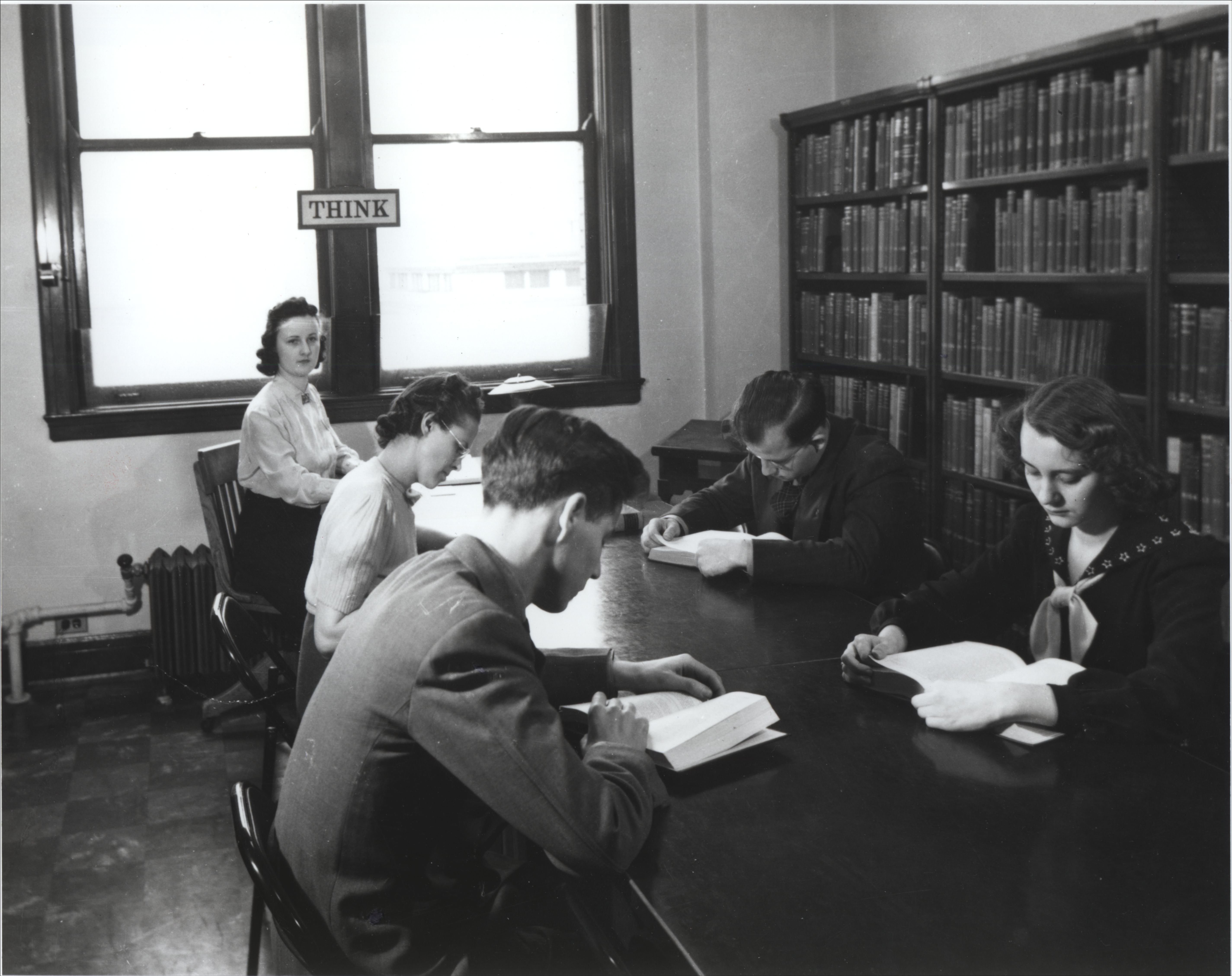 Claire Peters Bernacki sits under the "think" sign in the original Walsh Library, at the institute on Madison Ave. 1940s. (from back of photo)
