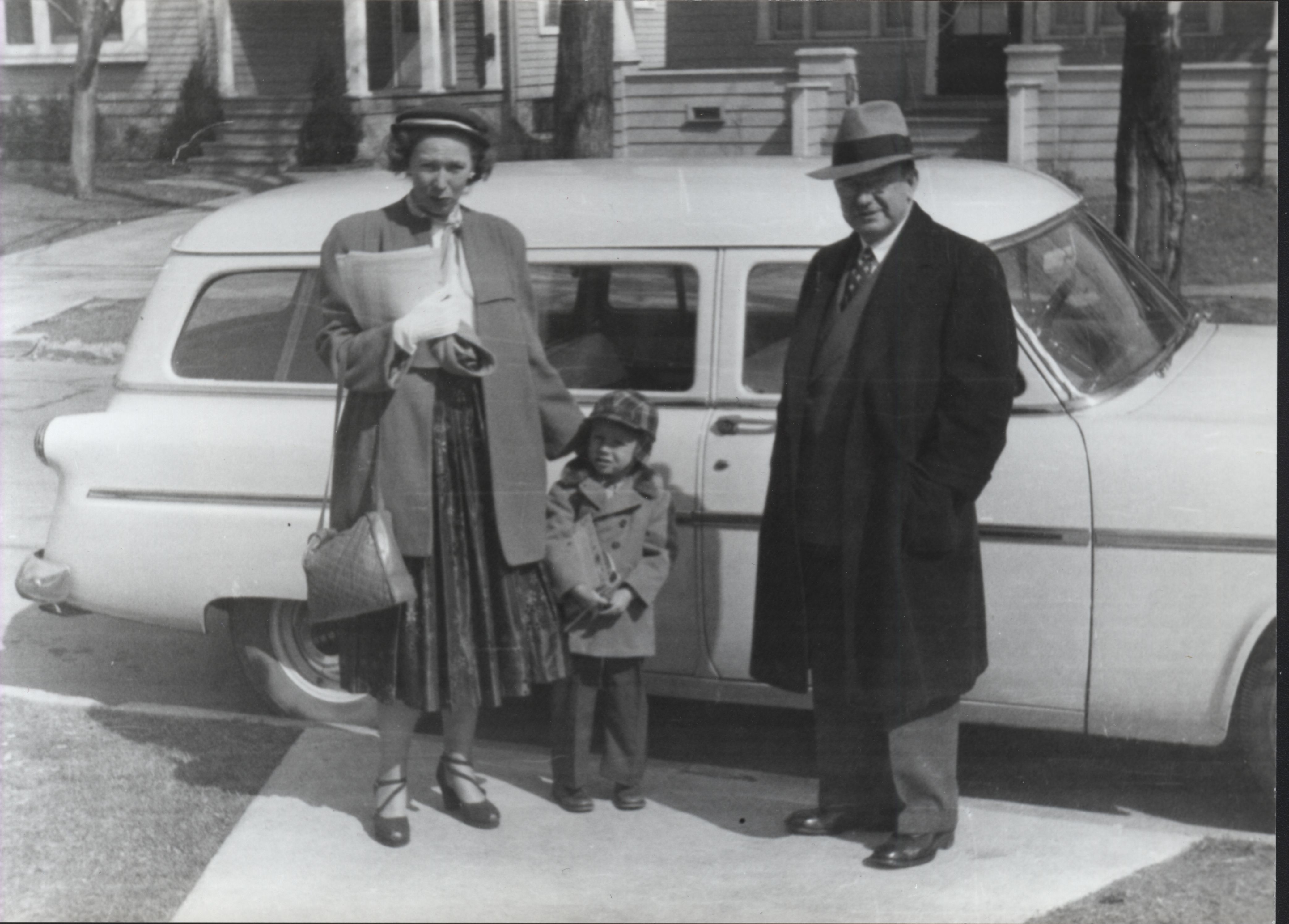 Martha Walsh (daughter-in-law), Mervyn B. Walsh (grandson), and Mervyn B. Walsh (founder) in front of his Grosse Pointe apartment in April, 1955. (from back of photo)