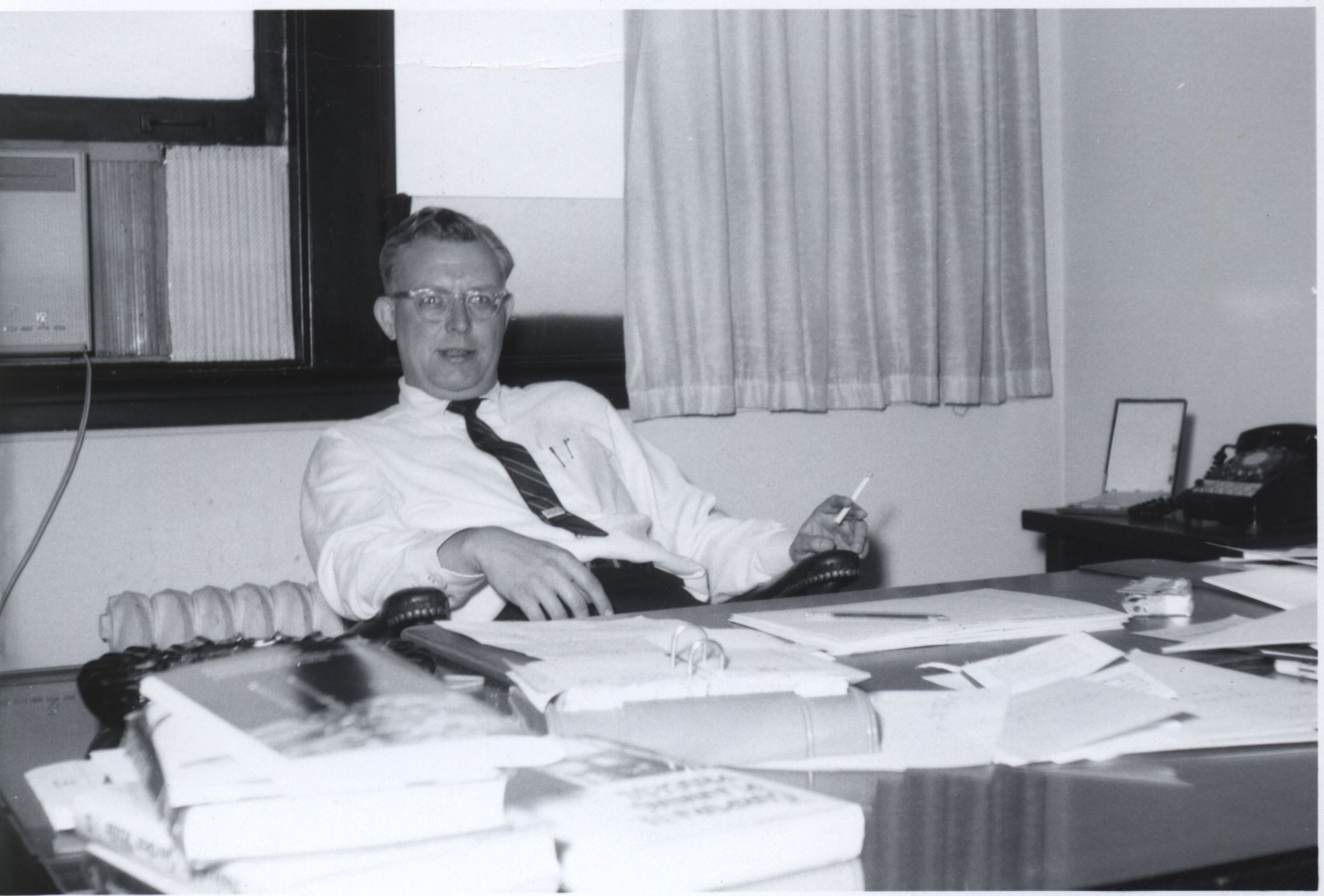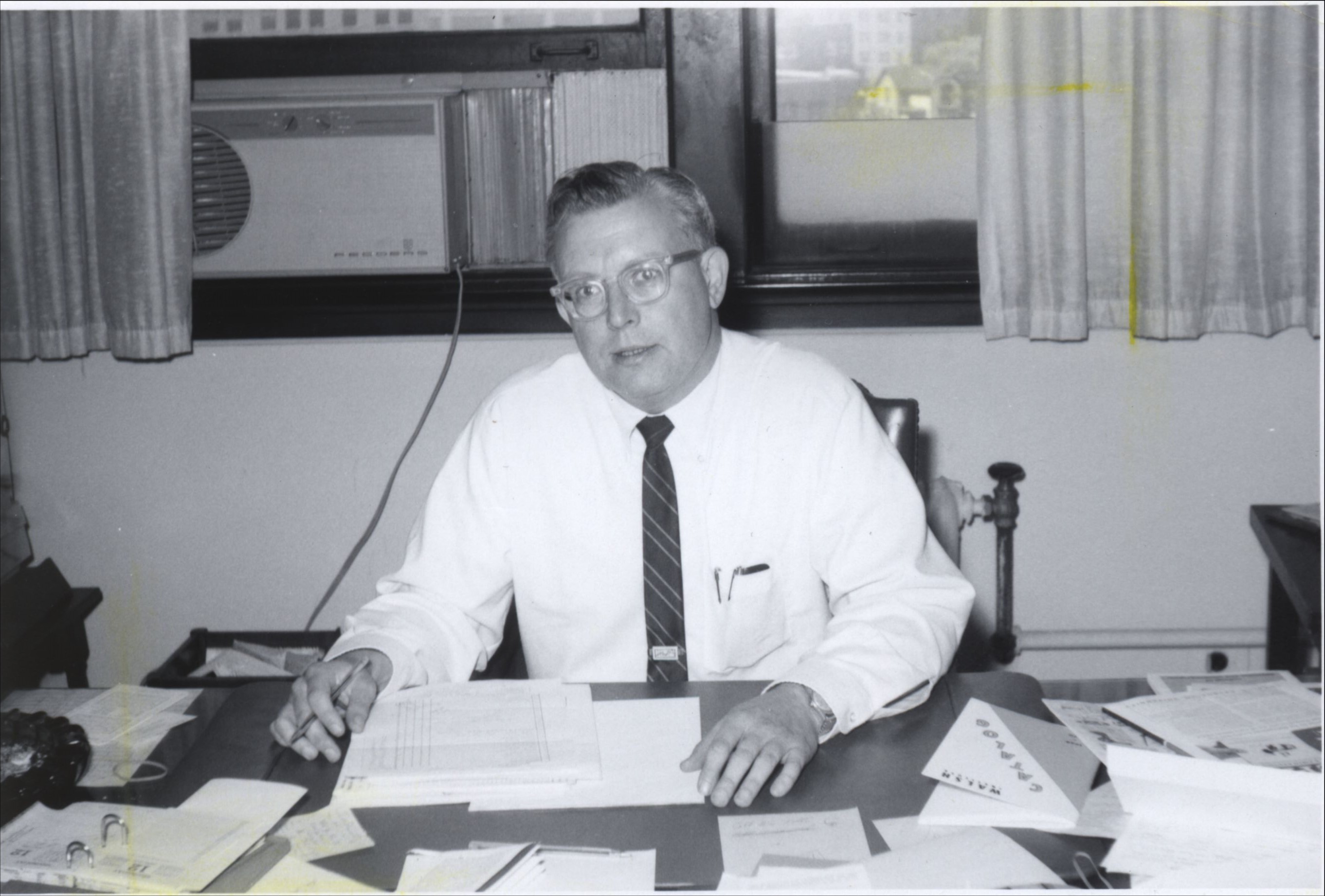 William C. Stewart, the second president of Walsh, in his office at the Institute downtown. (from back of photo, page 63 of Walsh History book)