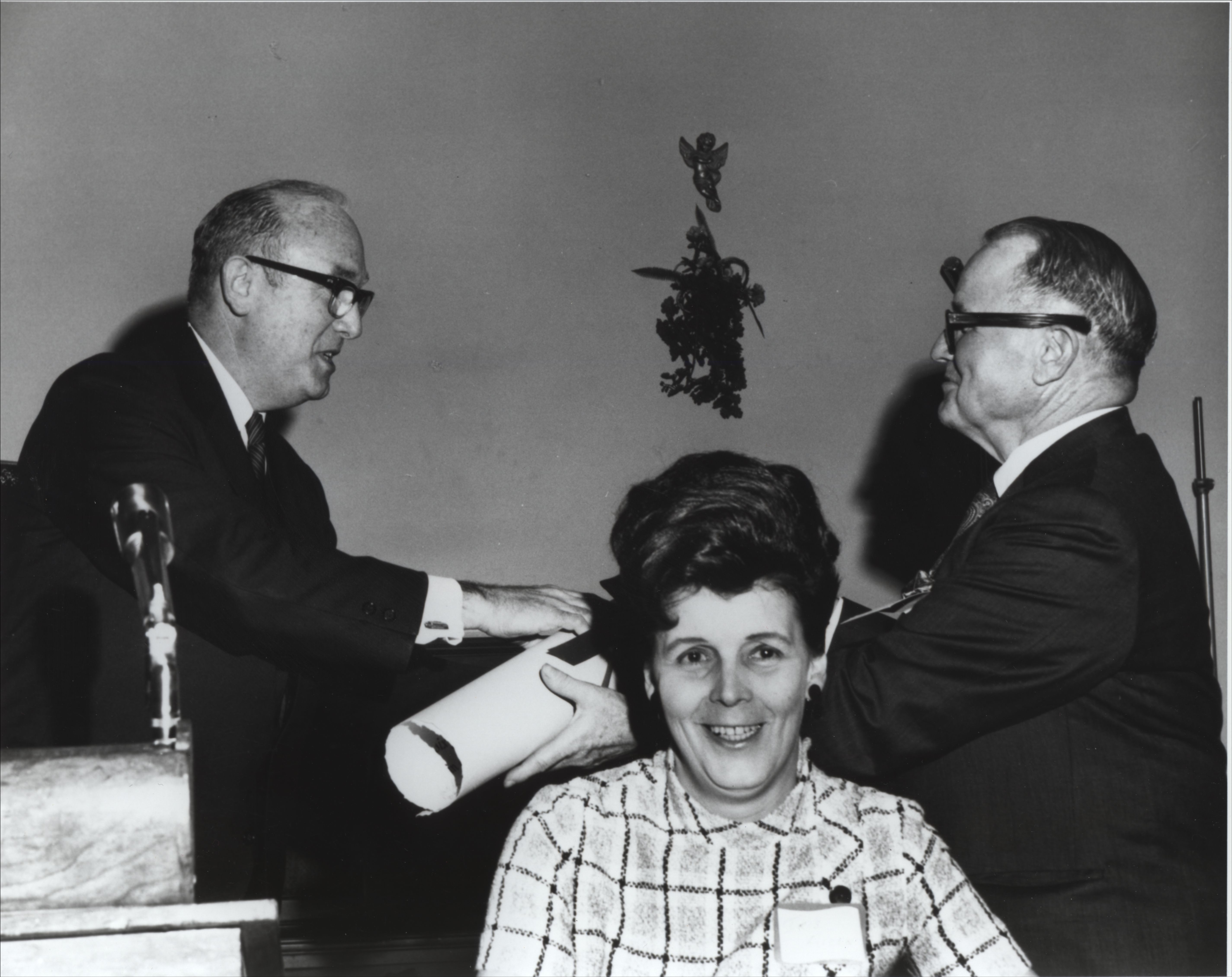 Archie Waring's (faculty) Retirement Dinner in 1969. From left, Herb Shilson (alum), Iris Allen (WCAA pres. That year, 1968-1969) and Archie Waring. (from back of photo)