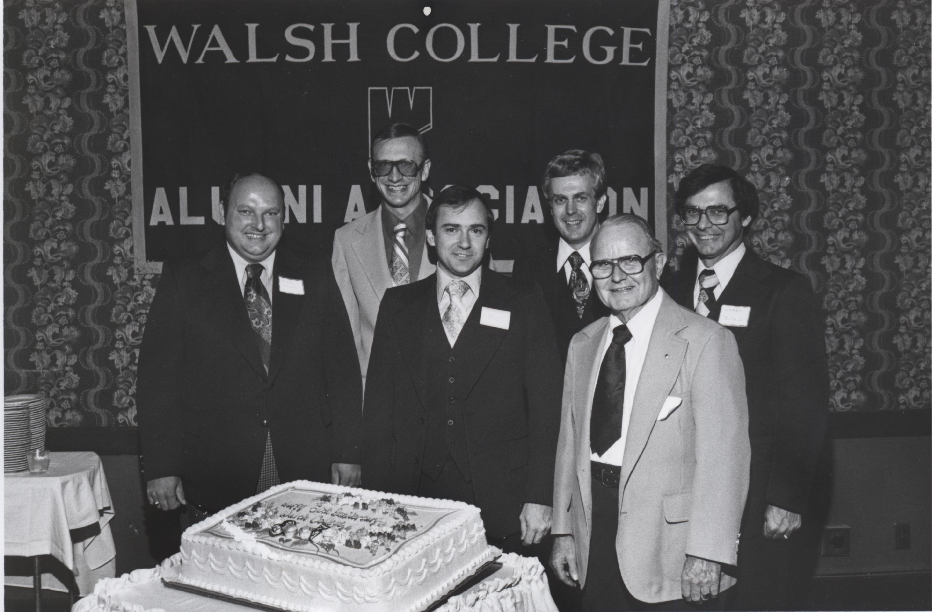Walsh College celebrated its 50th anniversary in 1972…pictured (left) Howard Wendell, Don Carr, Don Clayton, Terry Kaye, Archie Waring & Larry Burala (from back of photo, page 98 of Walsh History book)