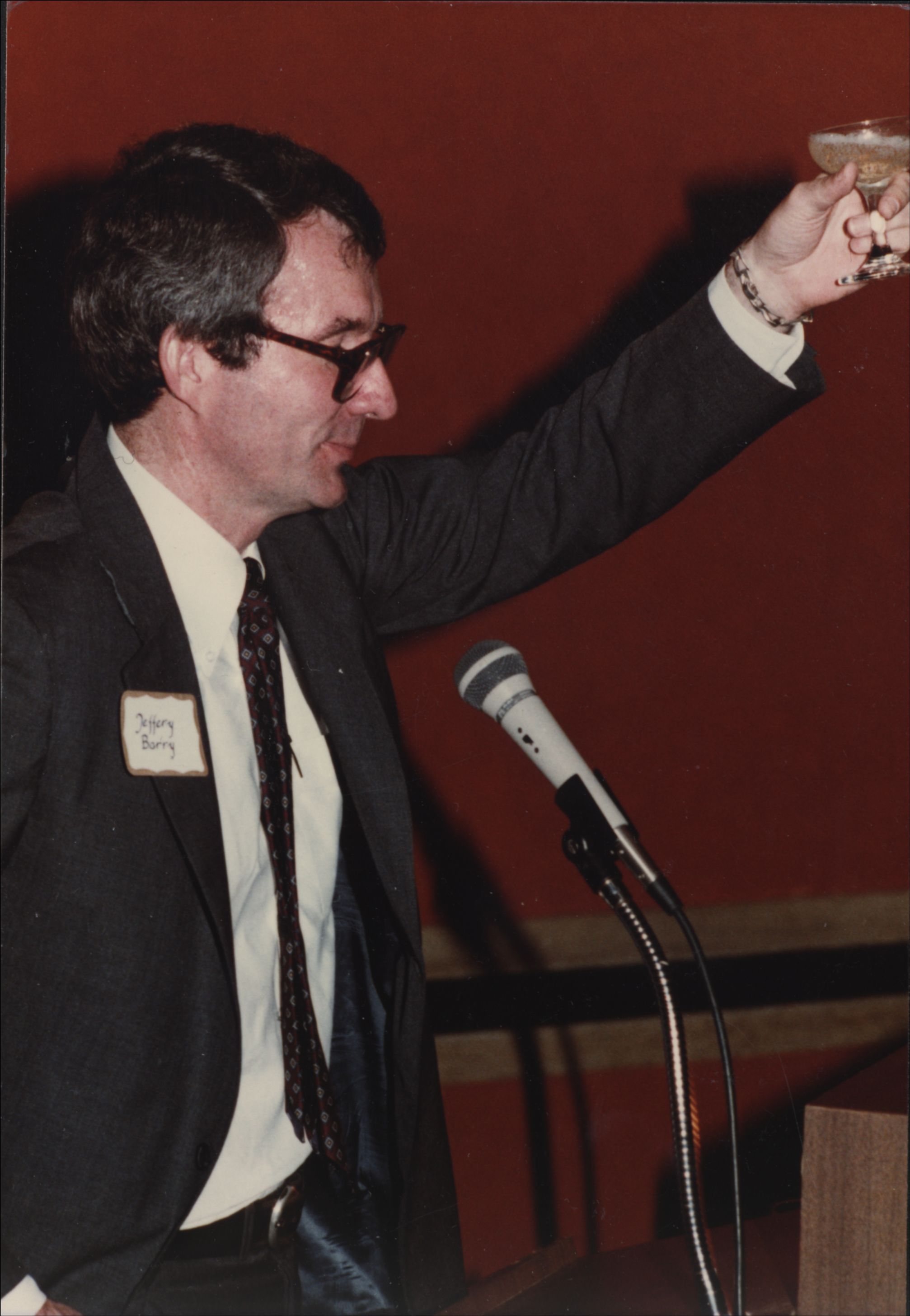 Jeff Barry (3rd President) raises a glass of champagne while speaking at a podium at an event for the 60th Anniversary of Walsh.