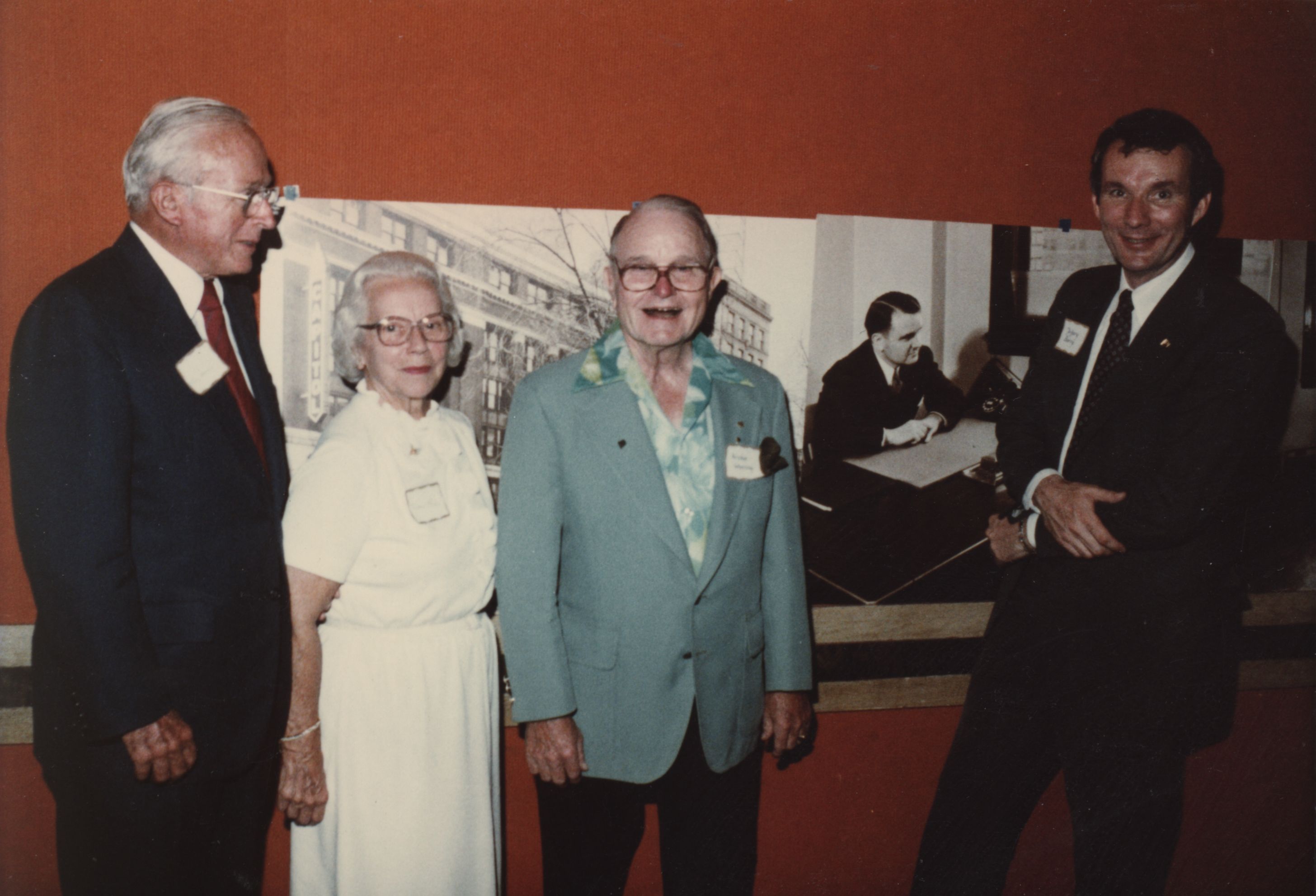 Jeff Barry (3rd President) and three other people in front of pictures of the early days of Walsh.