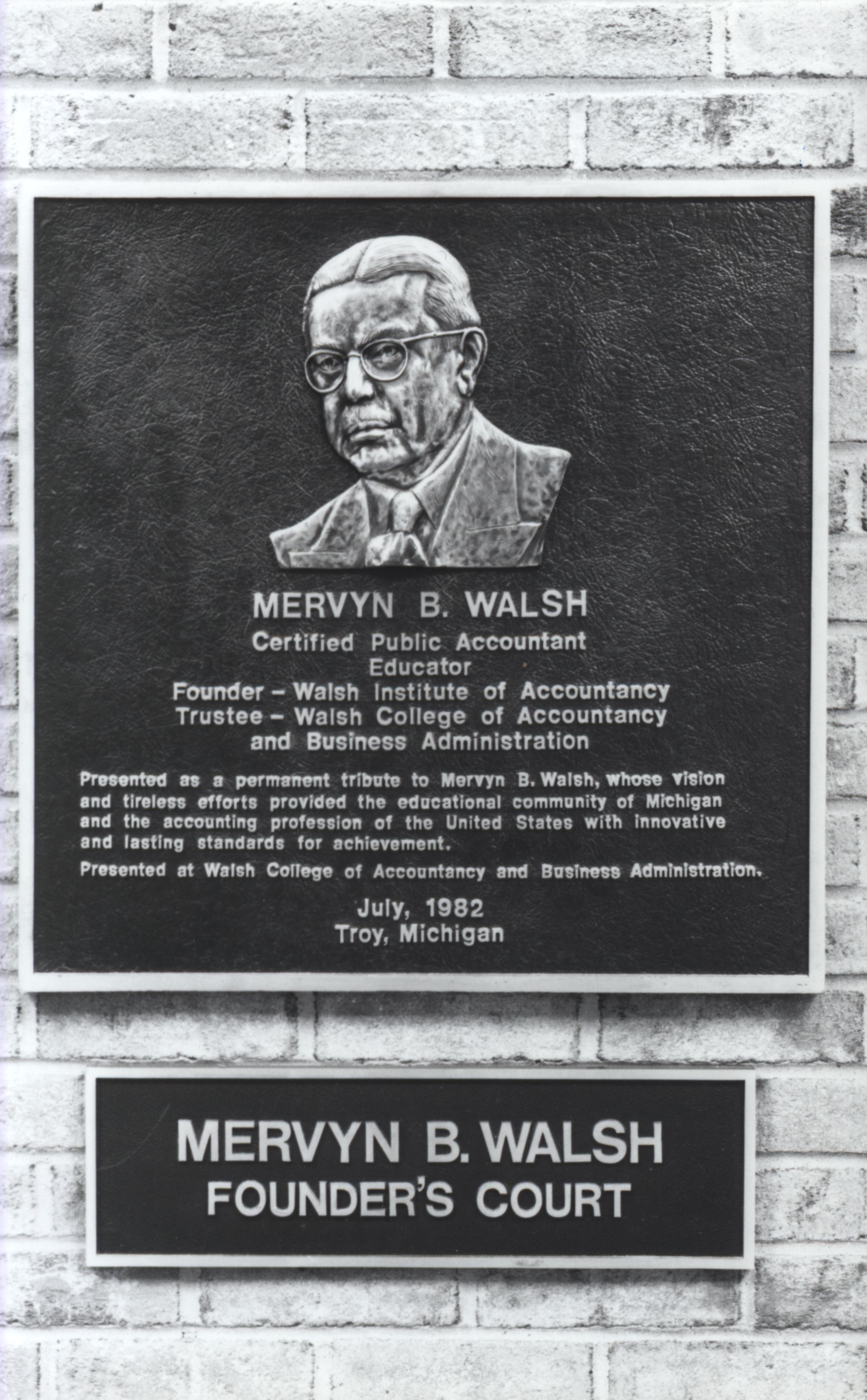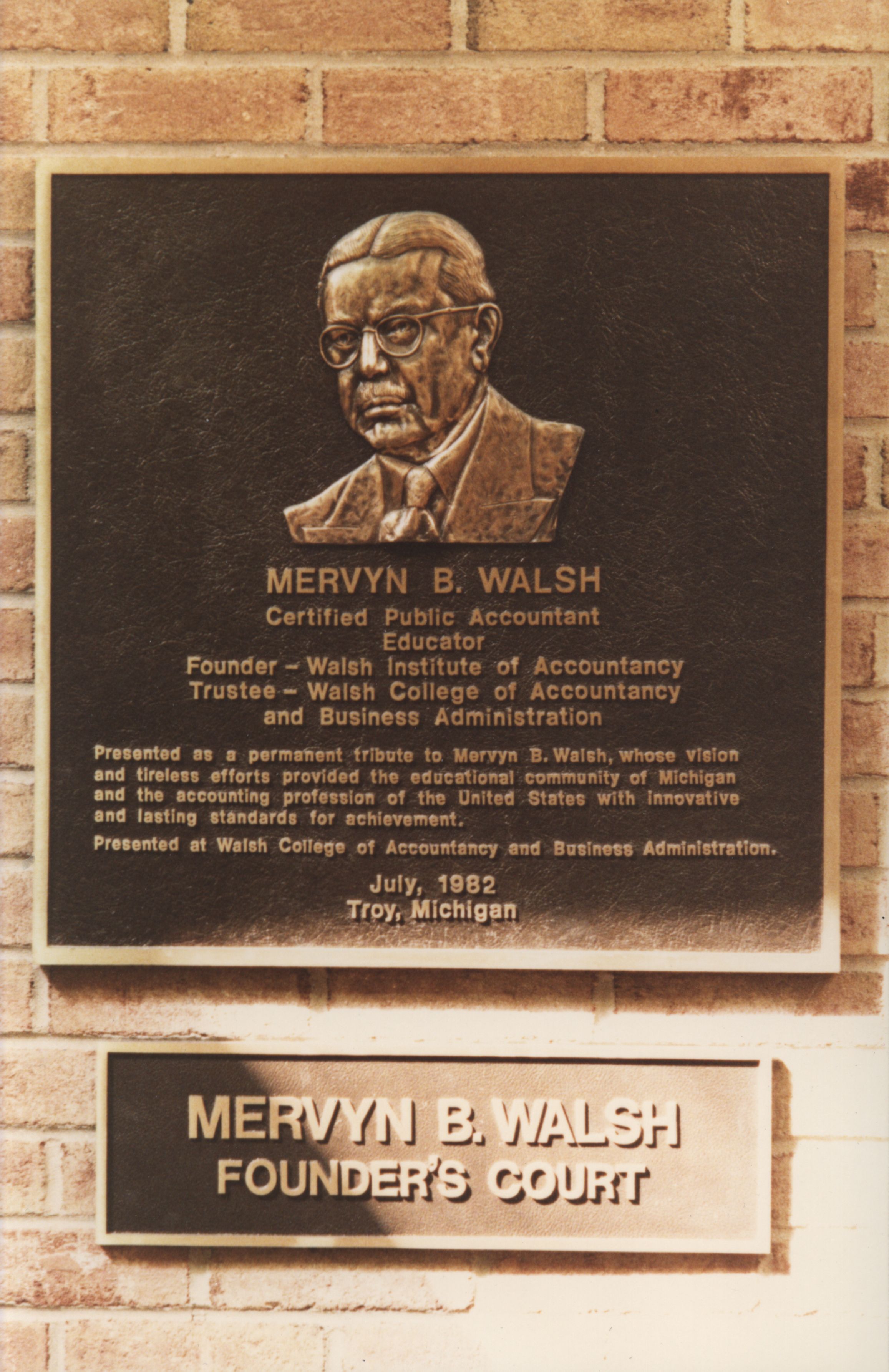 Plaque of Mervyn B. Walsh, July 1982, above Founder's Court sign