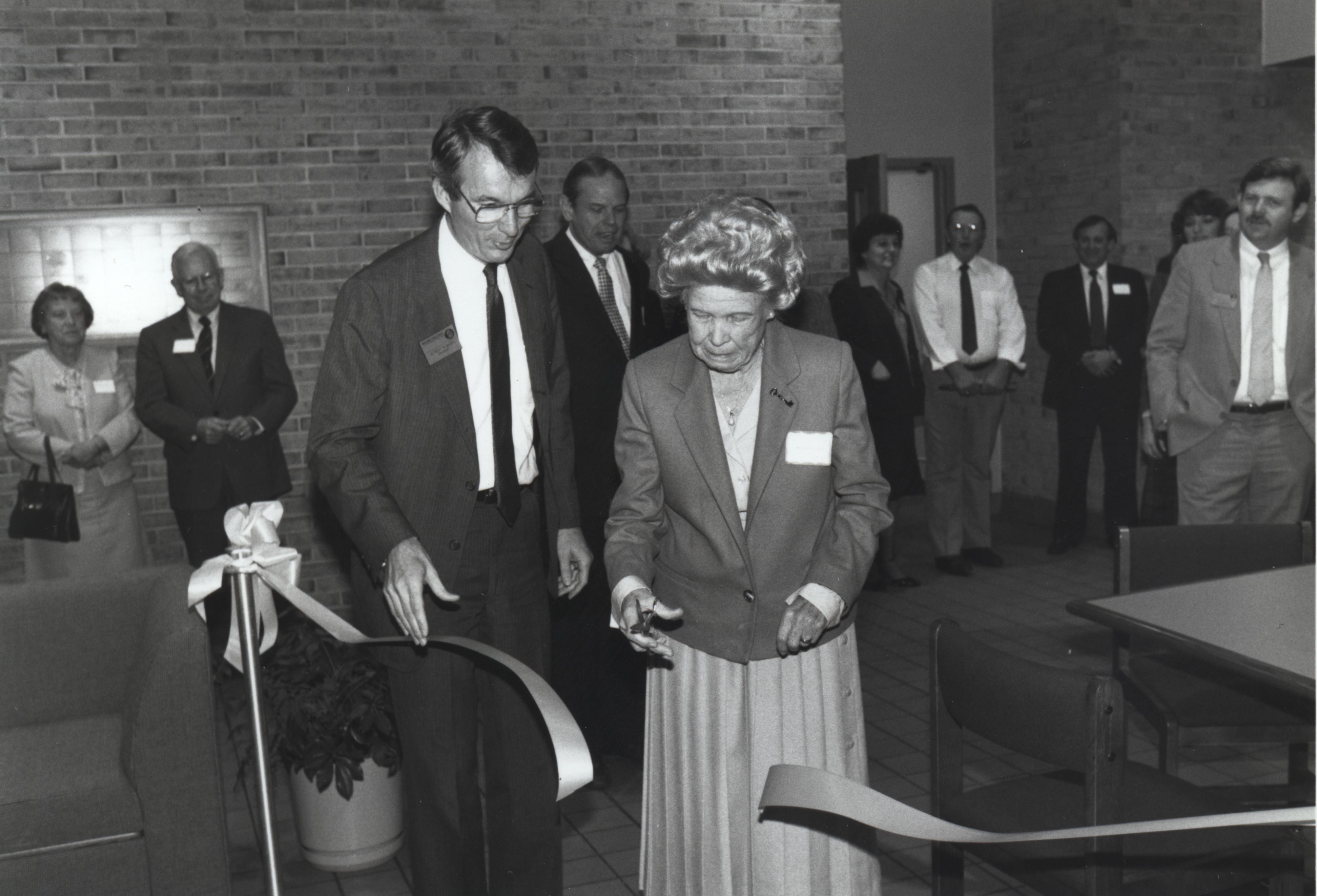 At right, Elsie Walsh, the founder's widow, cut the ribbon dedication the new skylight lounge as Founder's Court in 1984. Jeff Barry (3rd President) on her left. (from back of photo, pg. 123 in Walsh history book)