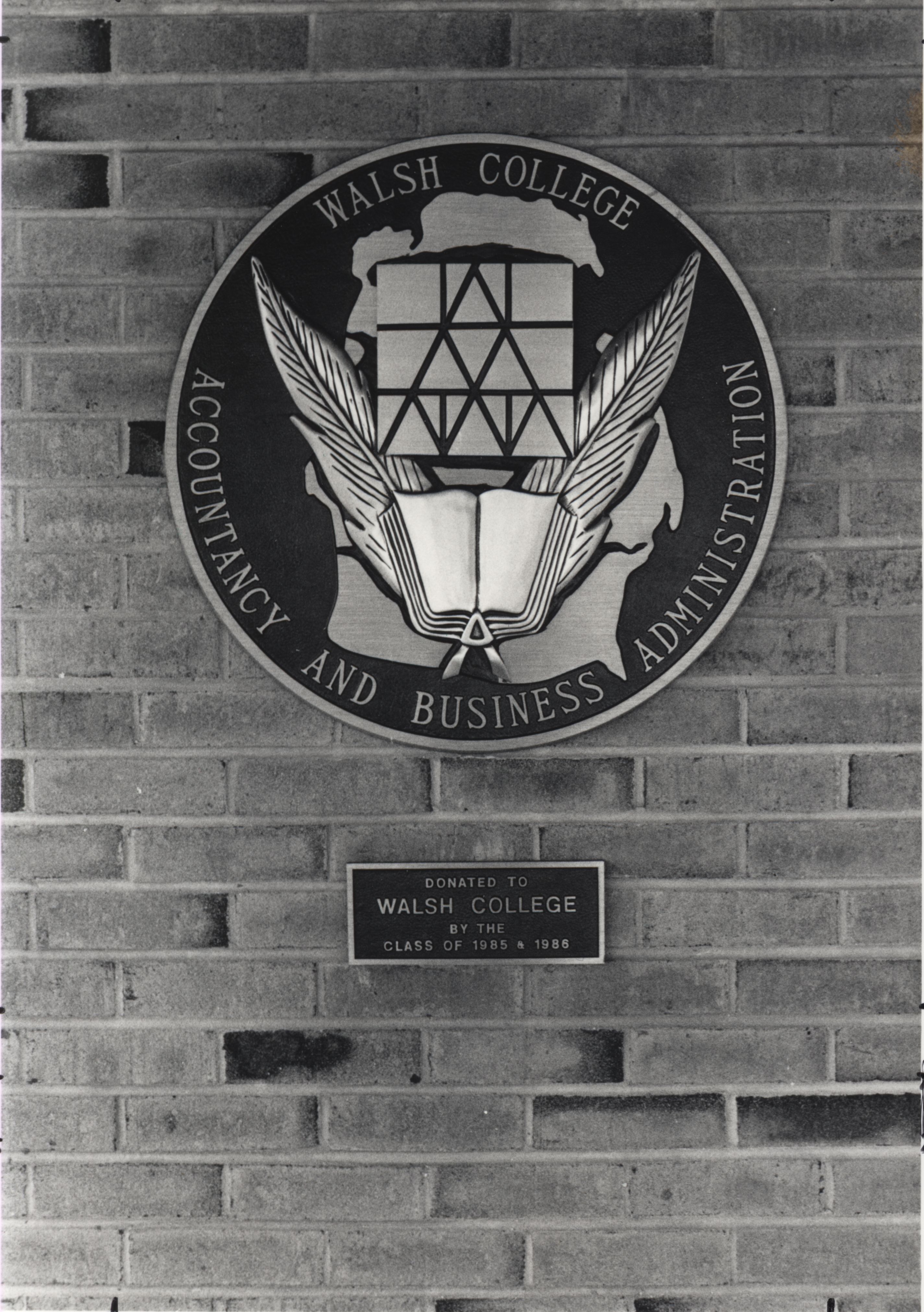 A plaque for the Walsh College of Accountancy and Business Administration donated by the classes of 1985 & 1986.