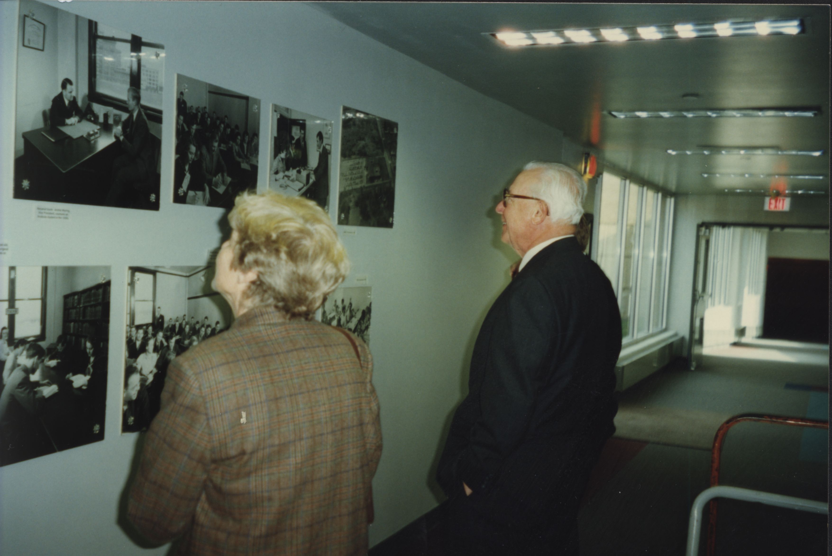 In Nov., 1997, Former Walsh Institute & Walsh College President William C. Stewart visited the College he helped establish. Bill Stewart and his wife look at photos of the old Walsh Institute. (from back of photo)