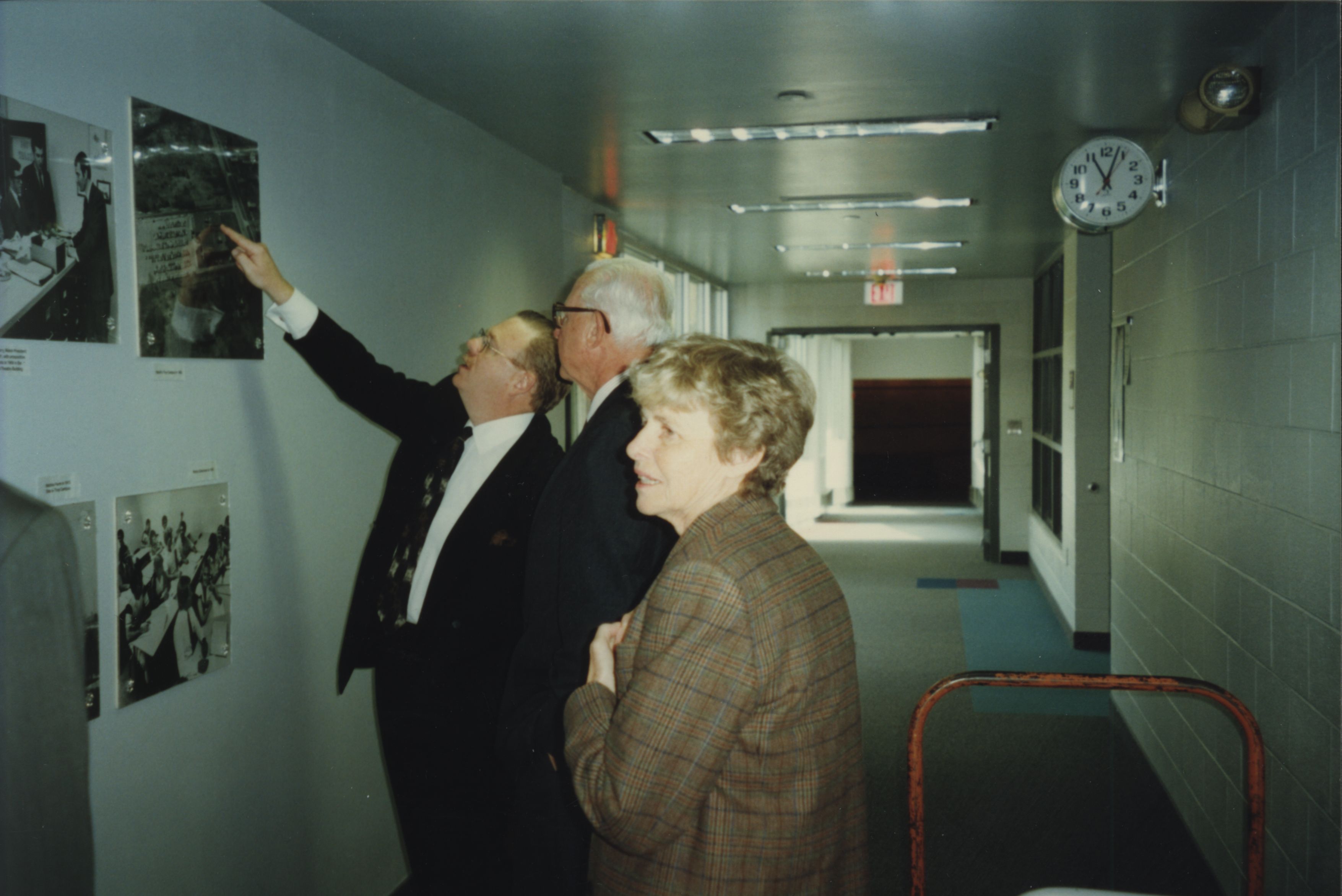 In Nov., 1997, Former Walsh Institute & Walsh College President William C. Stewart visited the College he helped establish. Bill Stewart's wife in foreground, with Dave Spencer (4th President) pointing at the historical photos (from back of photo)
