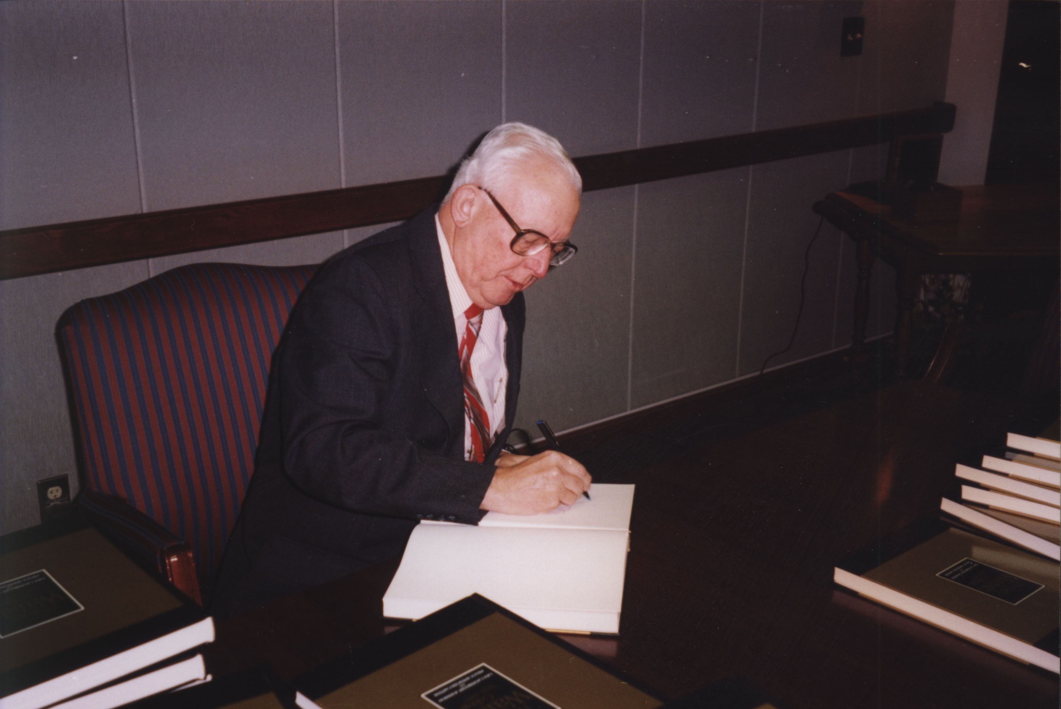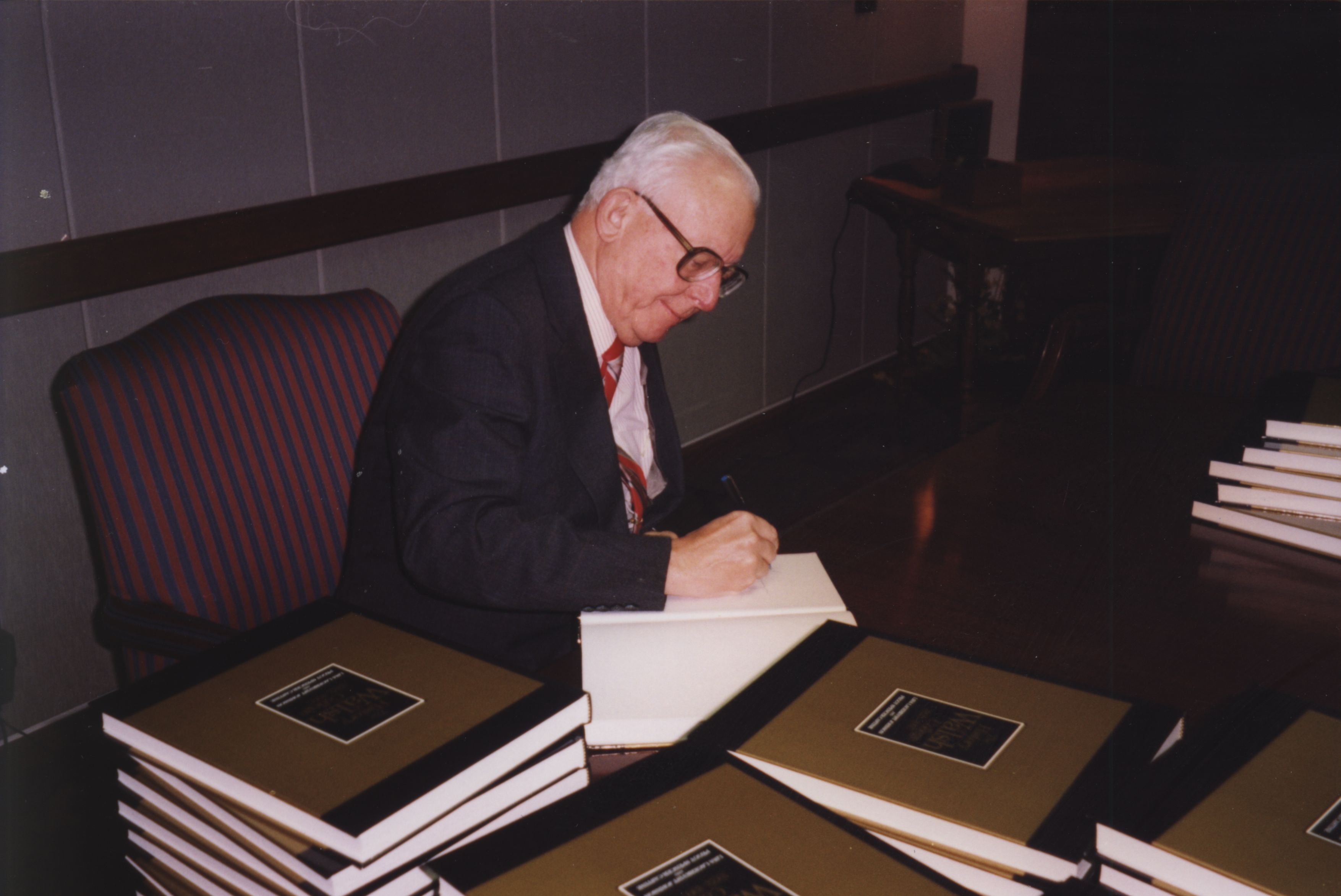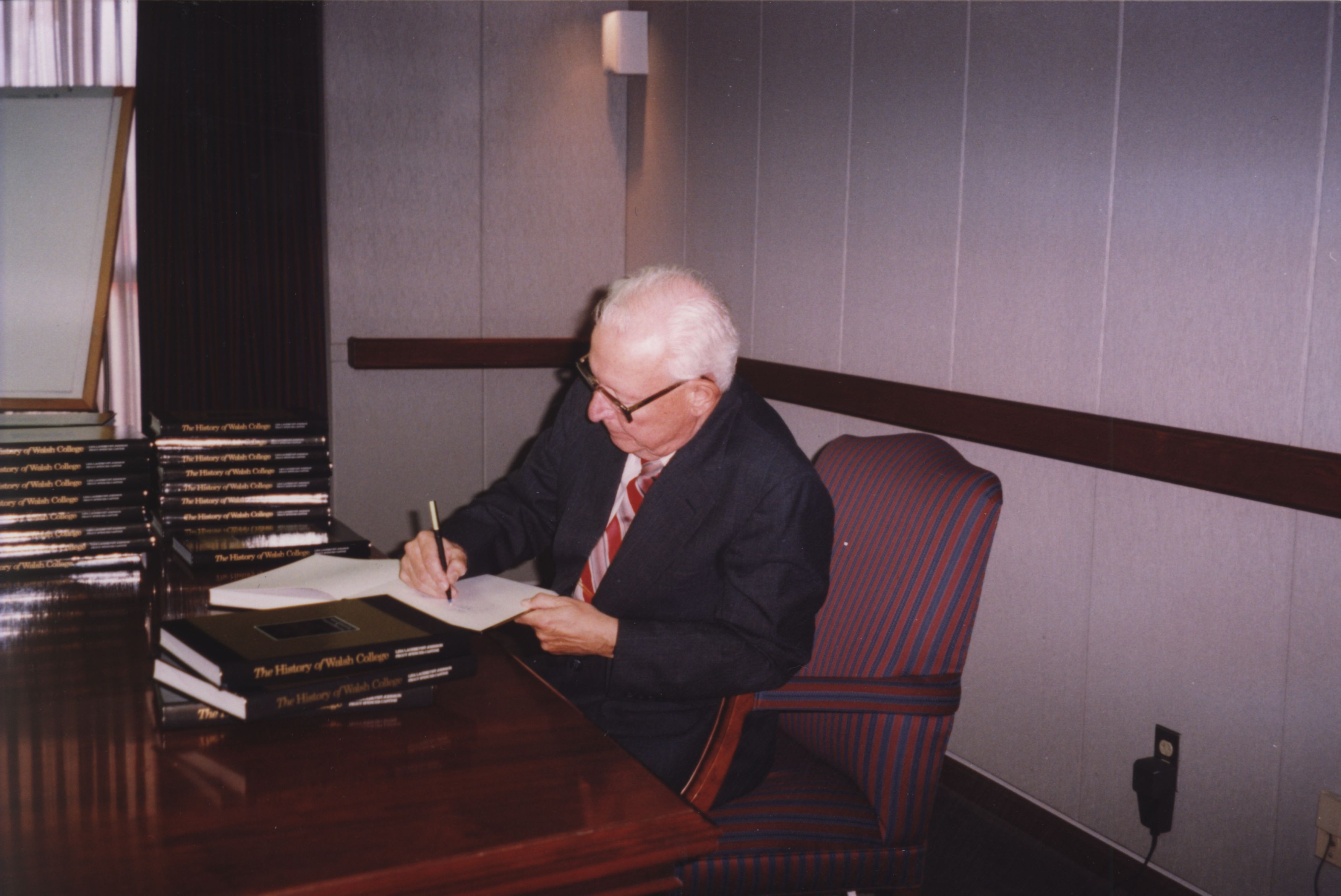 In Nov., 1997, Former Walsh Institute & Walsh College President William C. Stewart visited the College he helped establish, where he signed copies of the College's 75th Anniversary Book. (from back of photo)