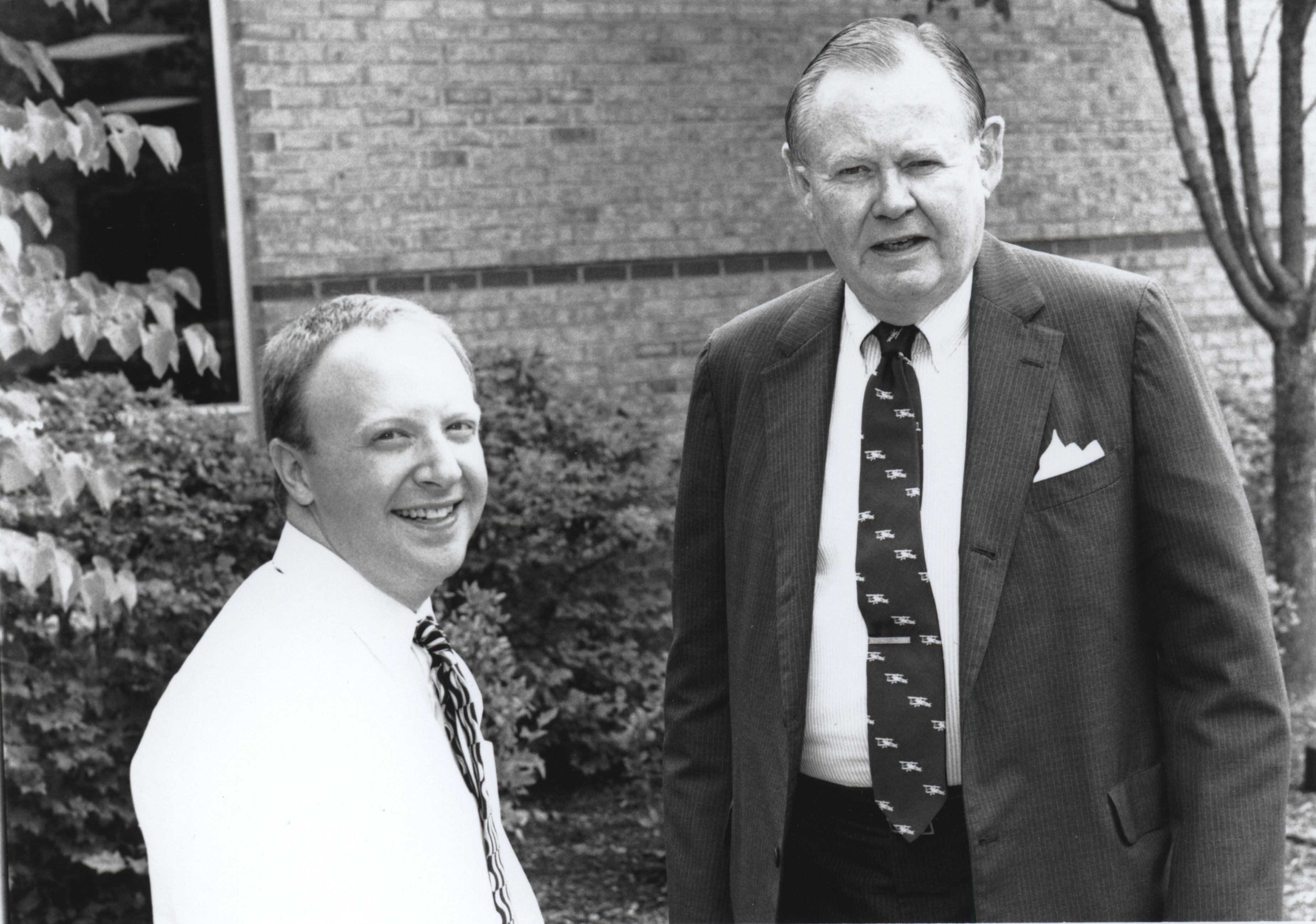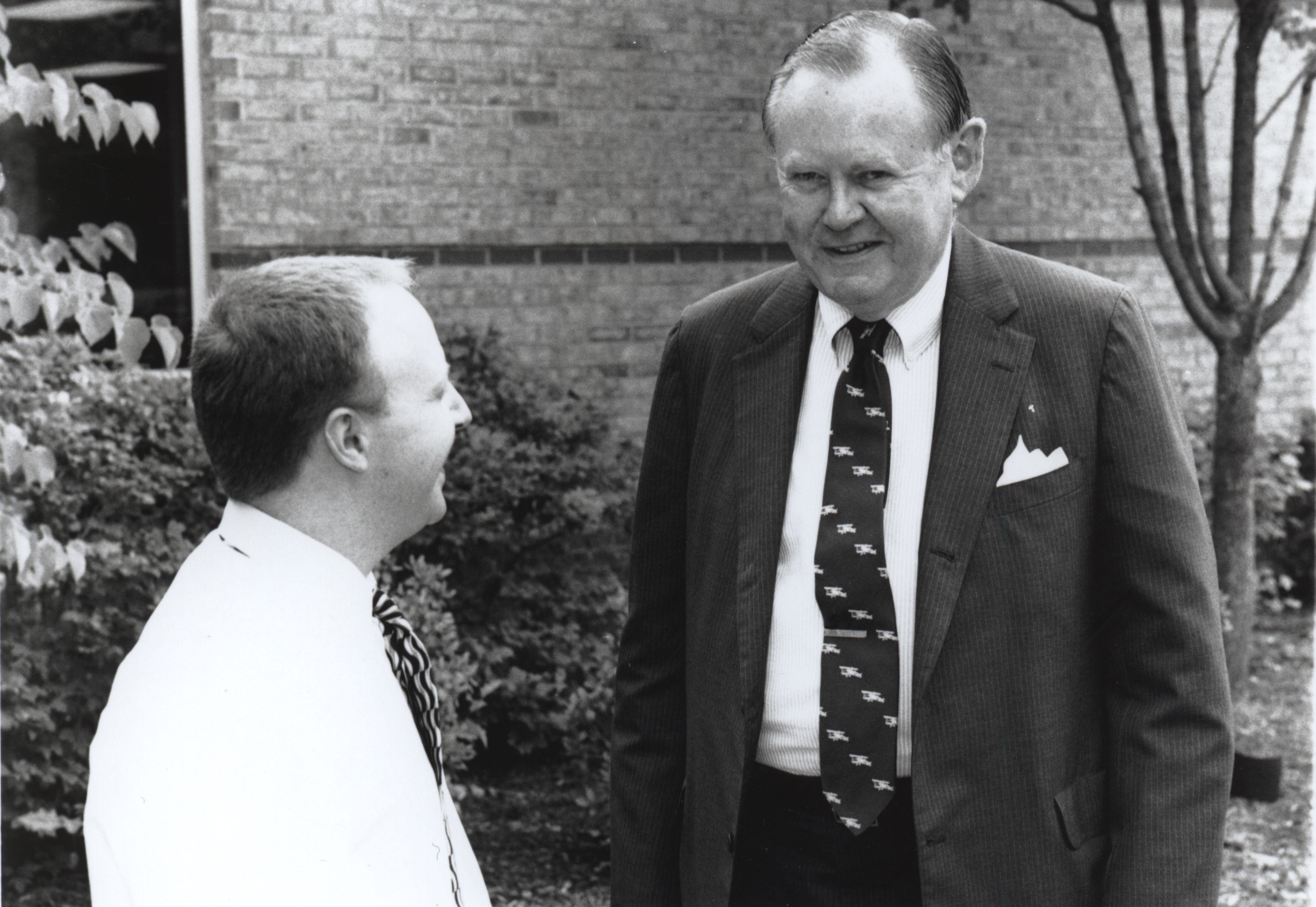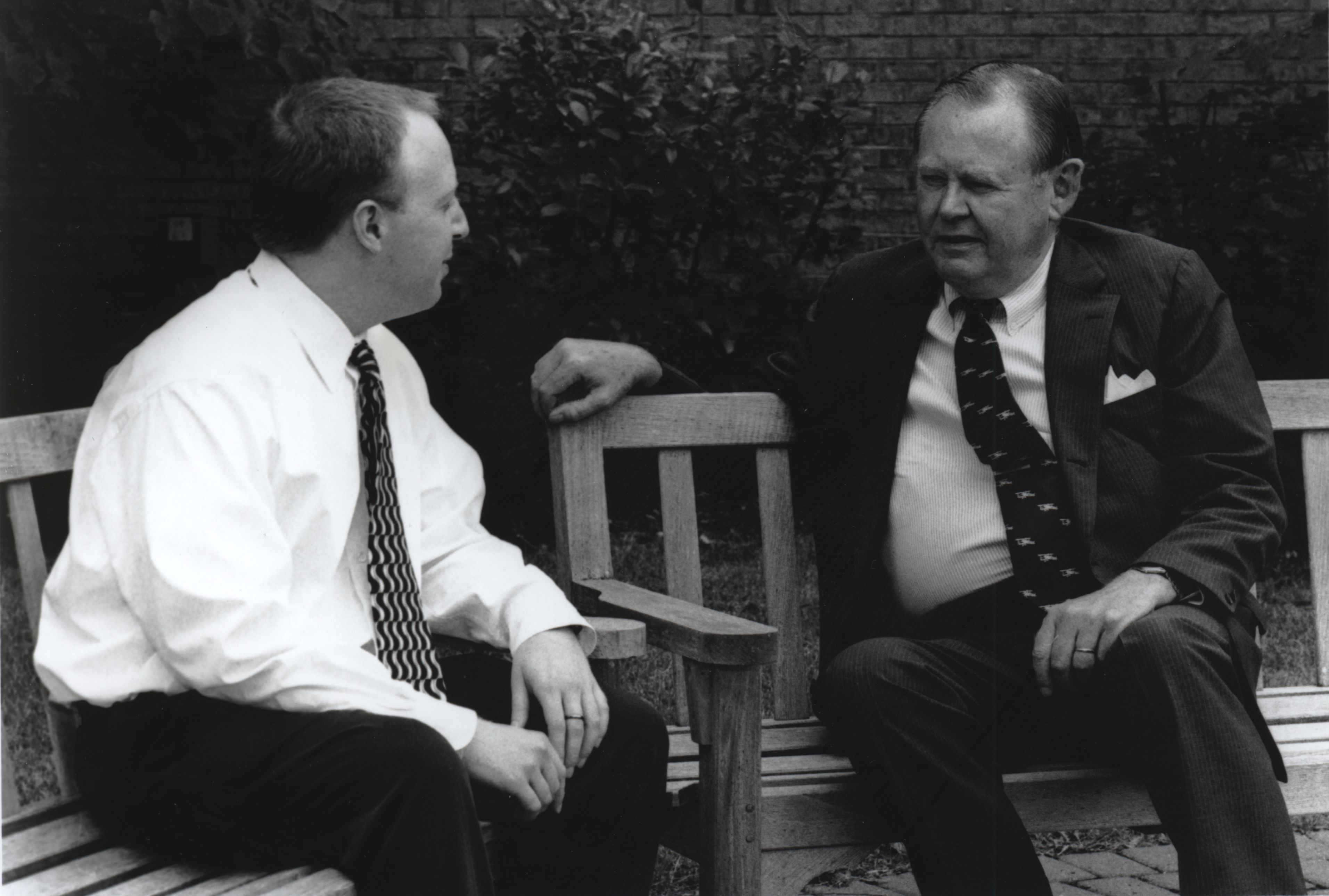 Paton Award winner Edward Dallwein and Walter Fisher (Bd. of Trustees) sit outside.