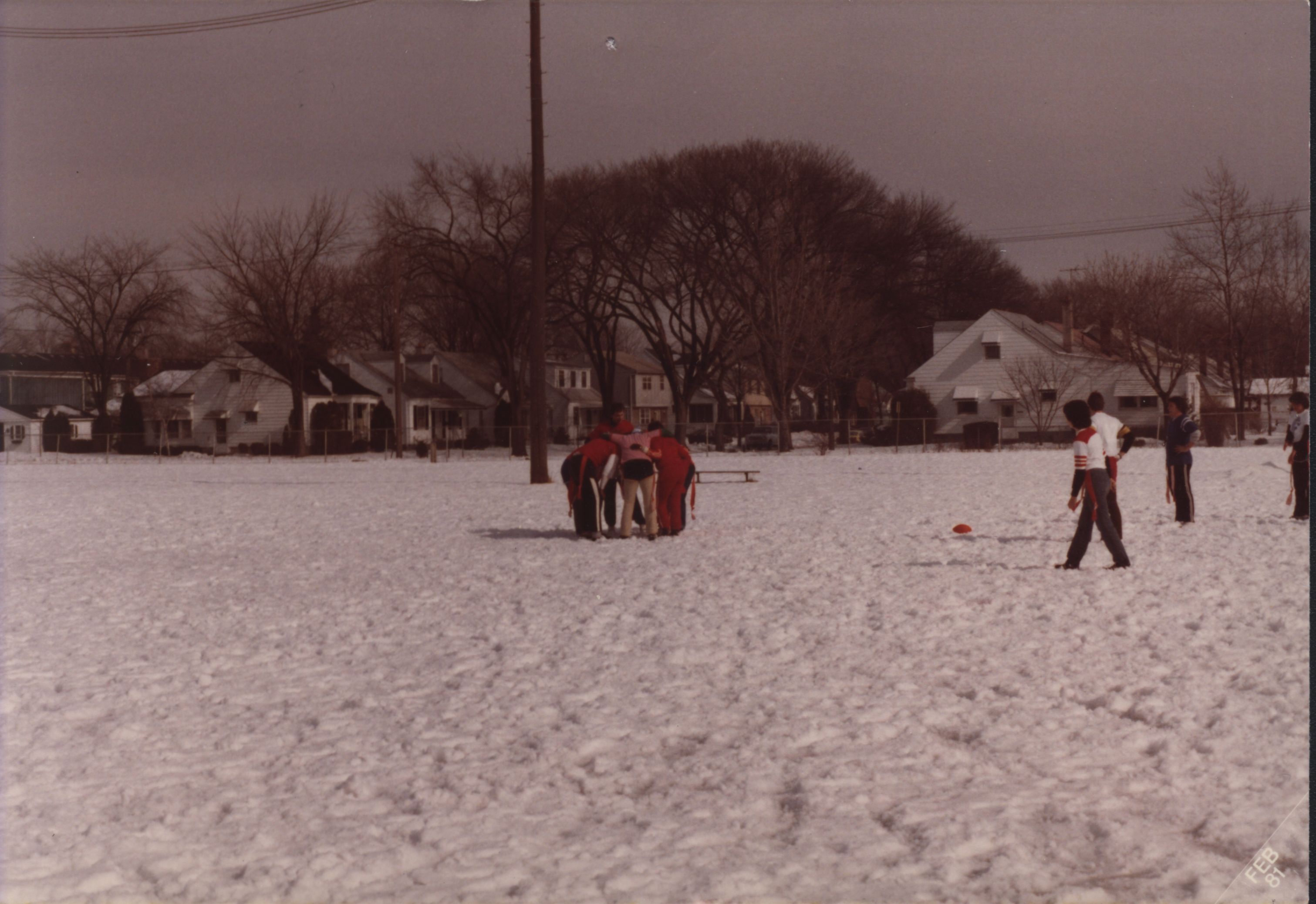 Two groups of people outside in the snow: one group is in a huddle and the other group is standing waiting for them to finish. Date unknown.