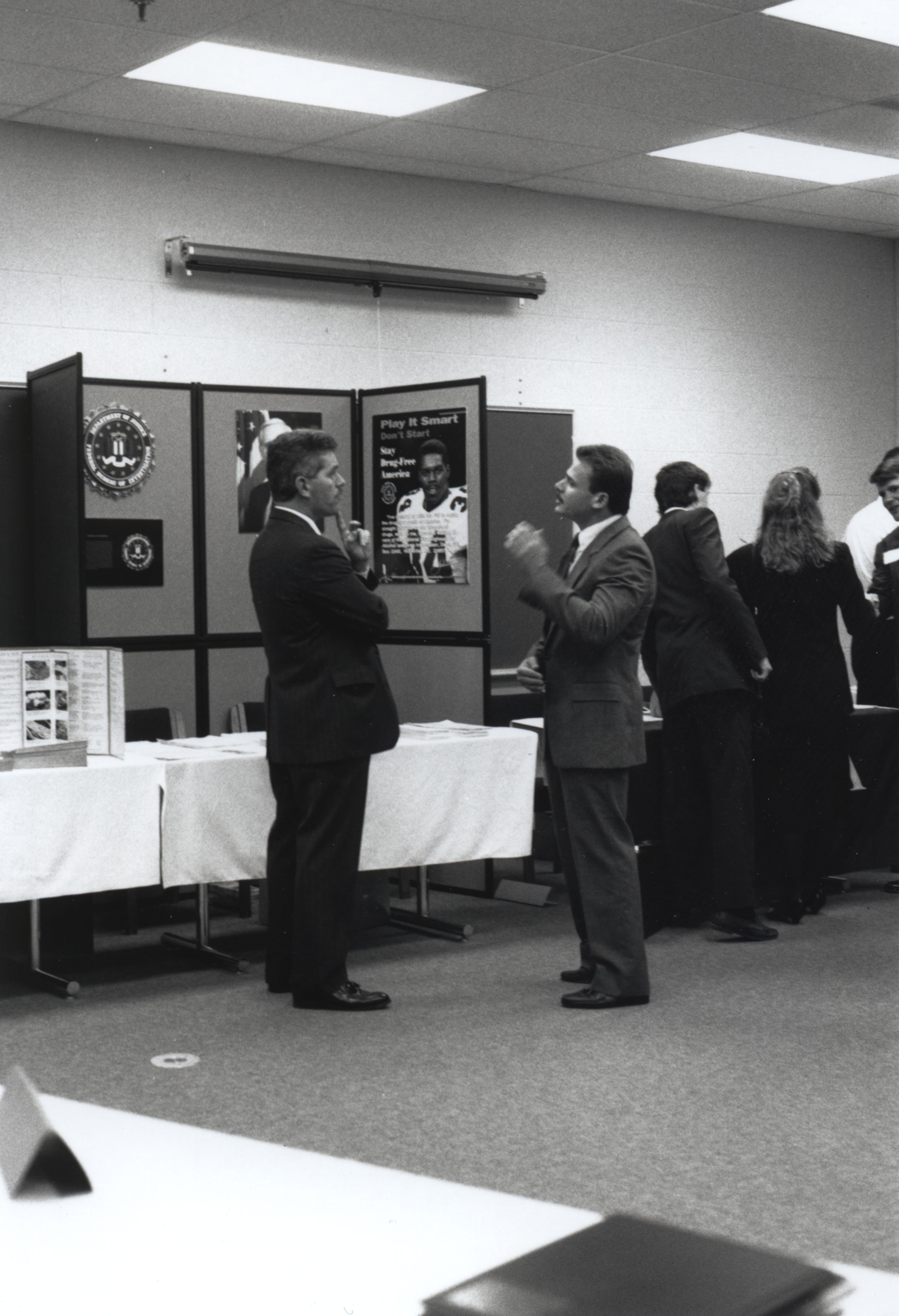 Two men talk in front of a presentation table at an event. Date unknown.
