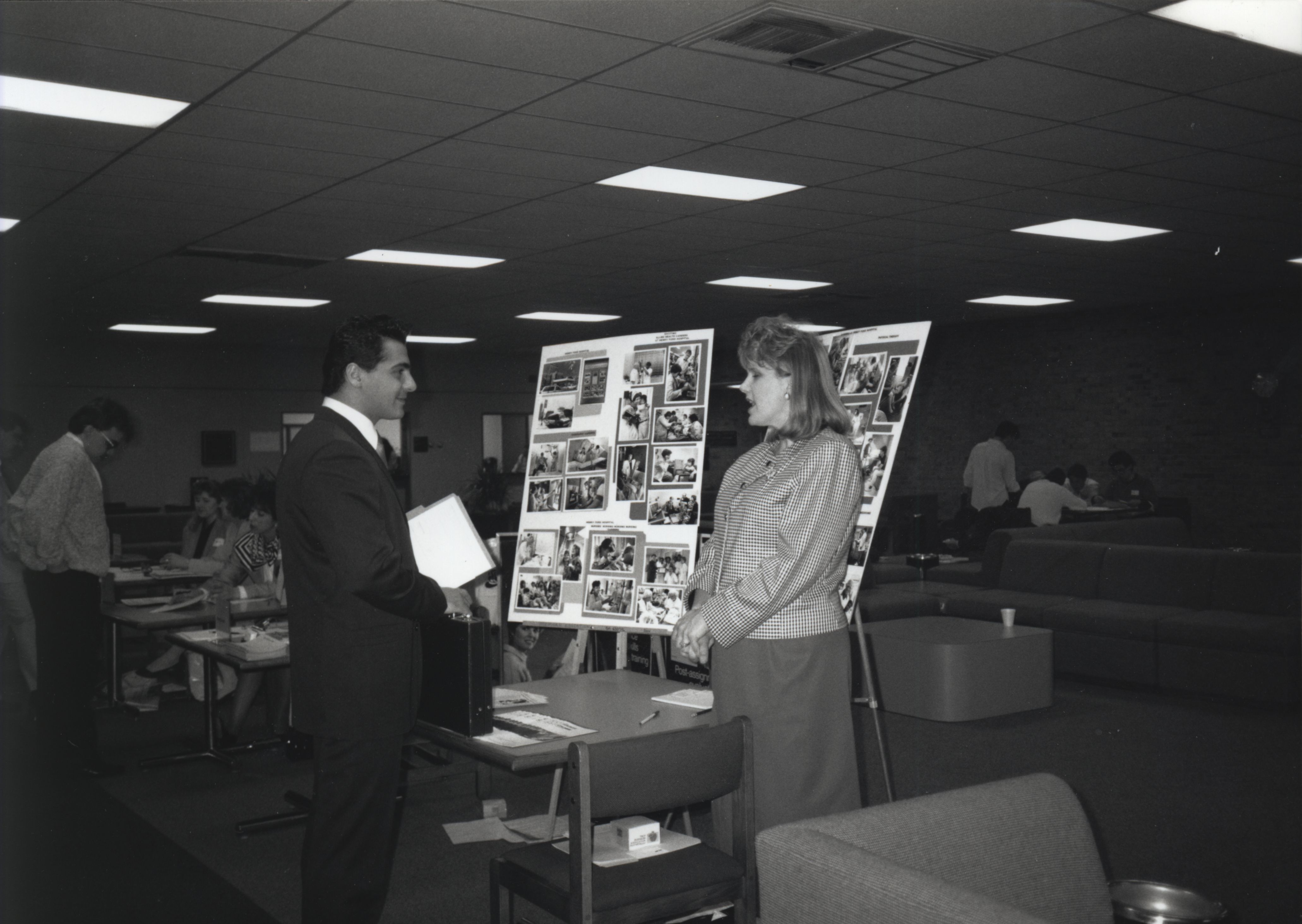 A man and a woman talk at an information table. Henry Ford Hospital Eugene Jamil BBA - Finance (from back of photo) Date unknown.