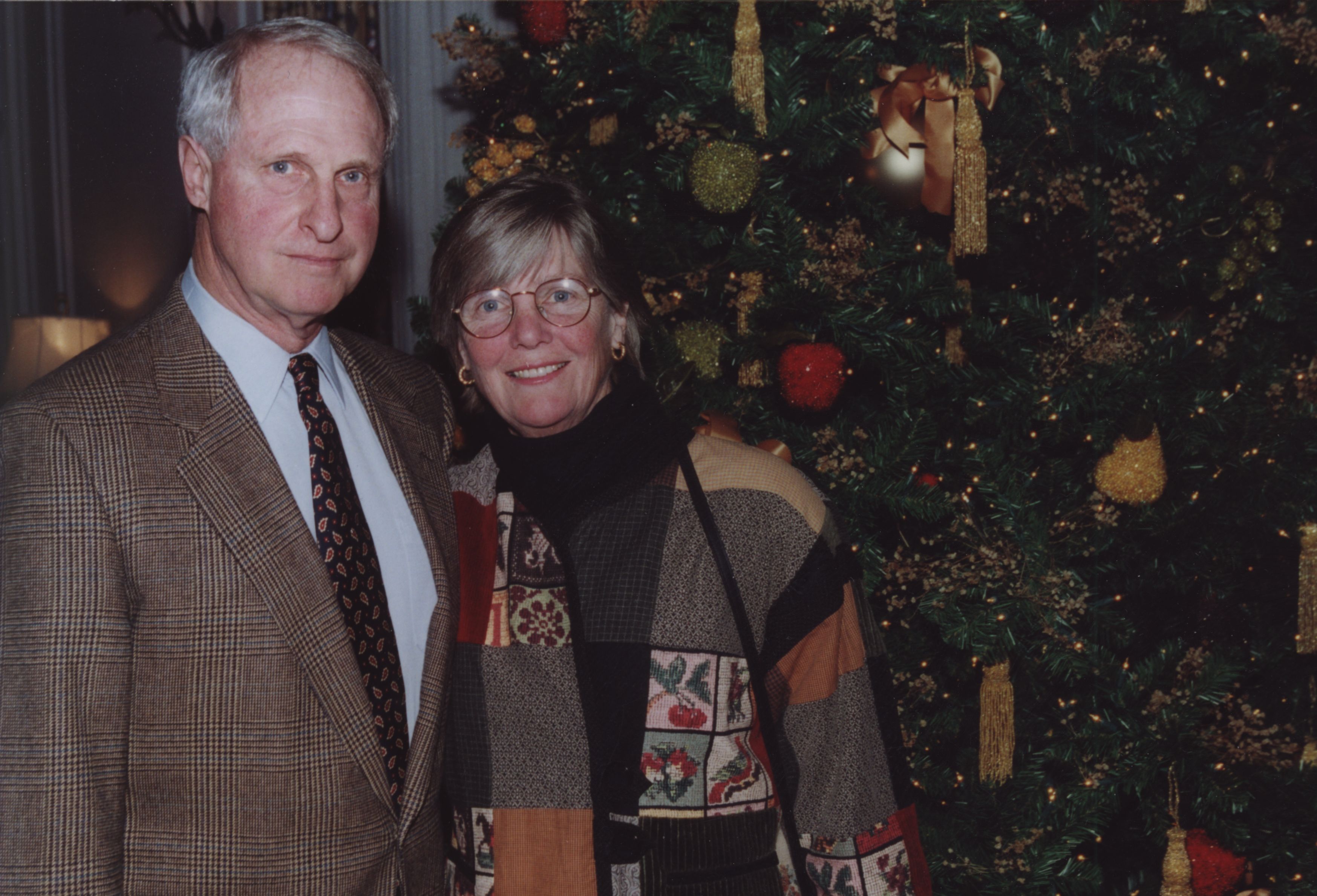 Stephen (Bd. of Trustees) and Jane Horn pose in front of a Christmas tree. Date unknown.