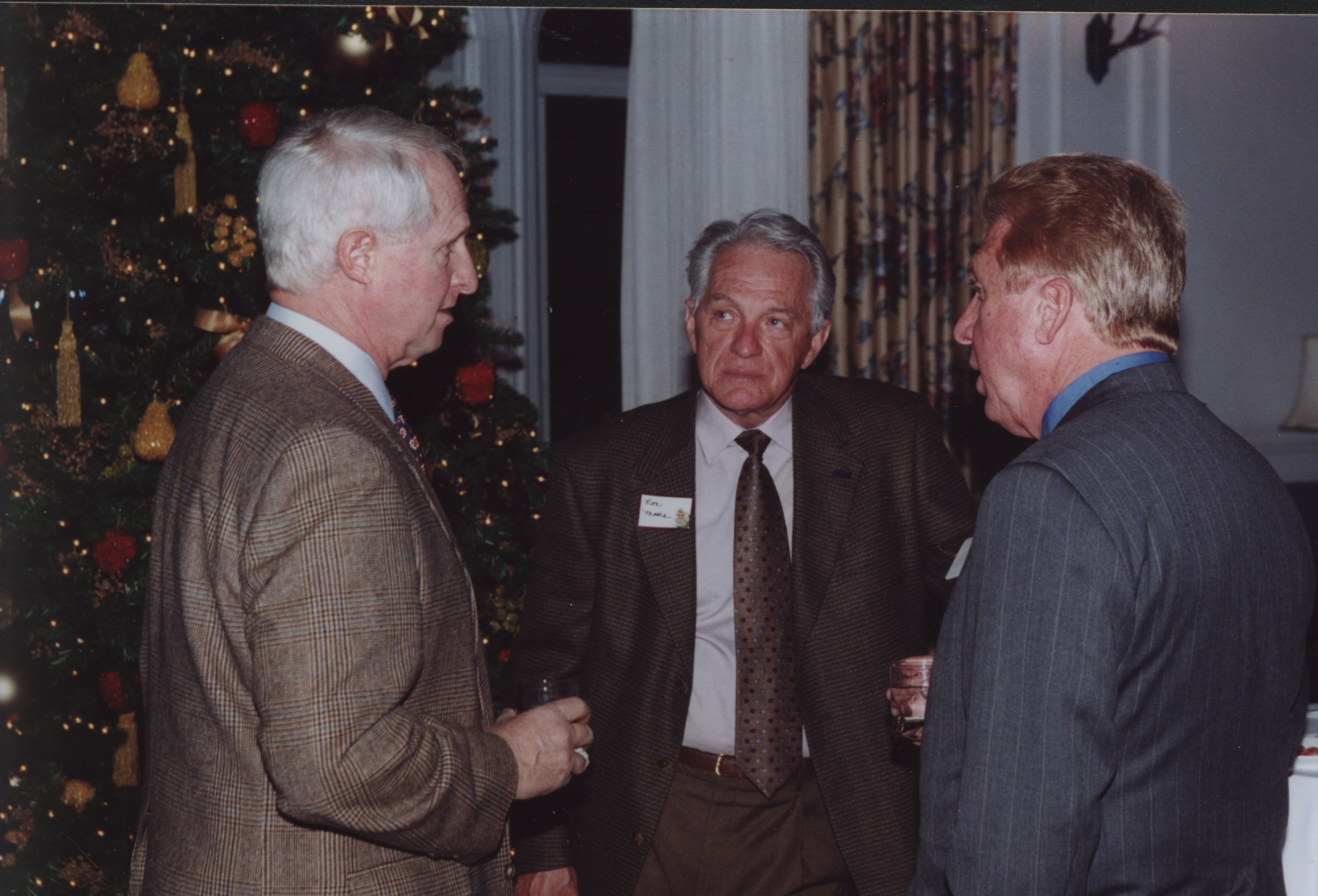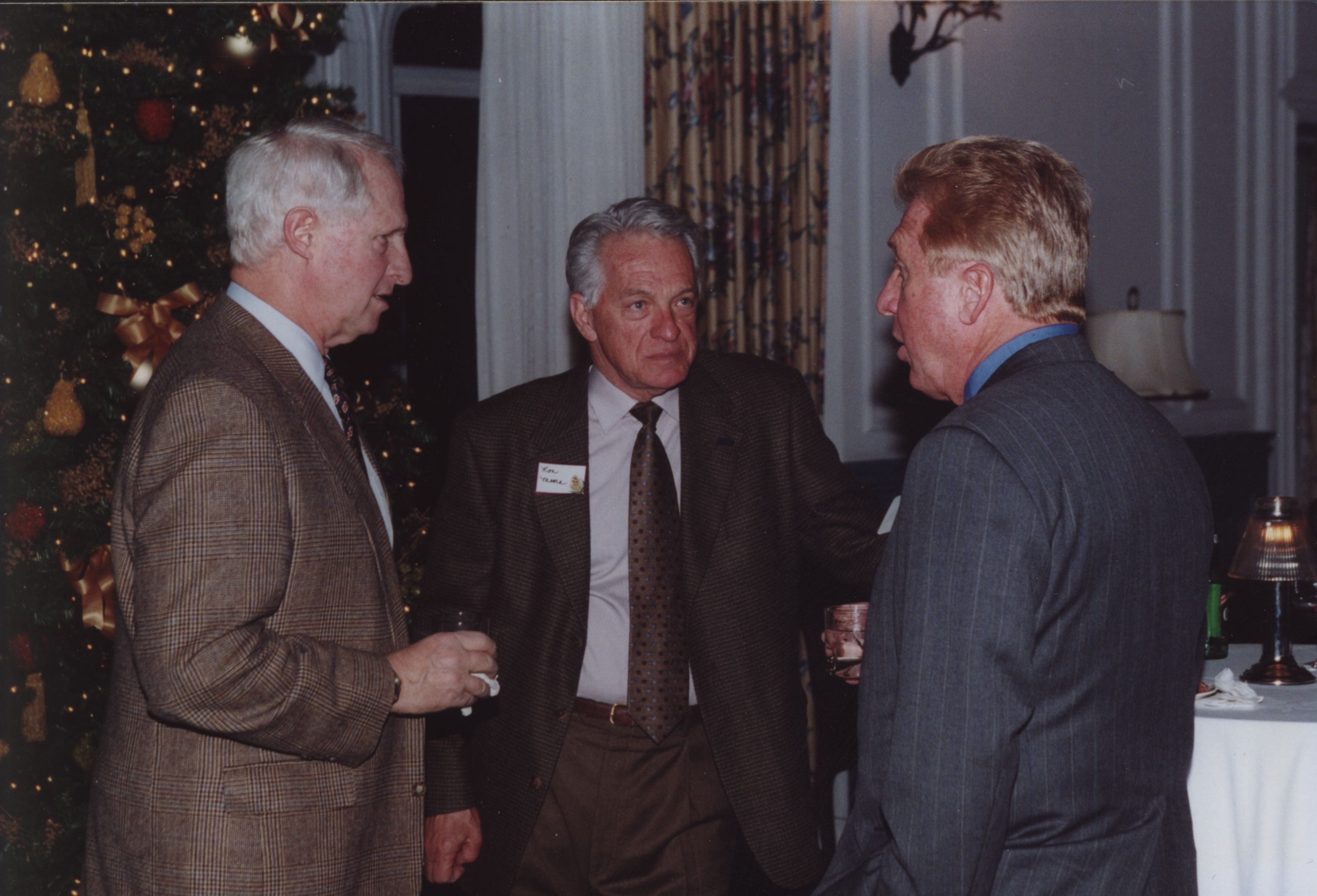 Stephen Horn (Bd. of Trustees) and two other men talk next to a Christmas tree. Date unknown.