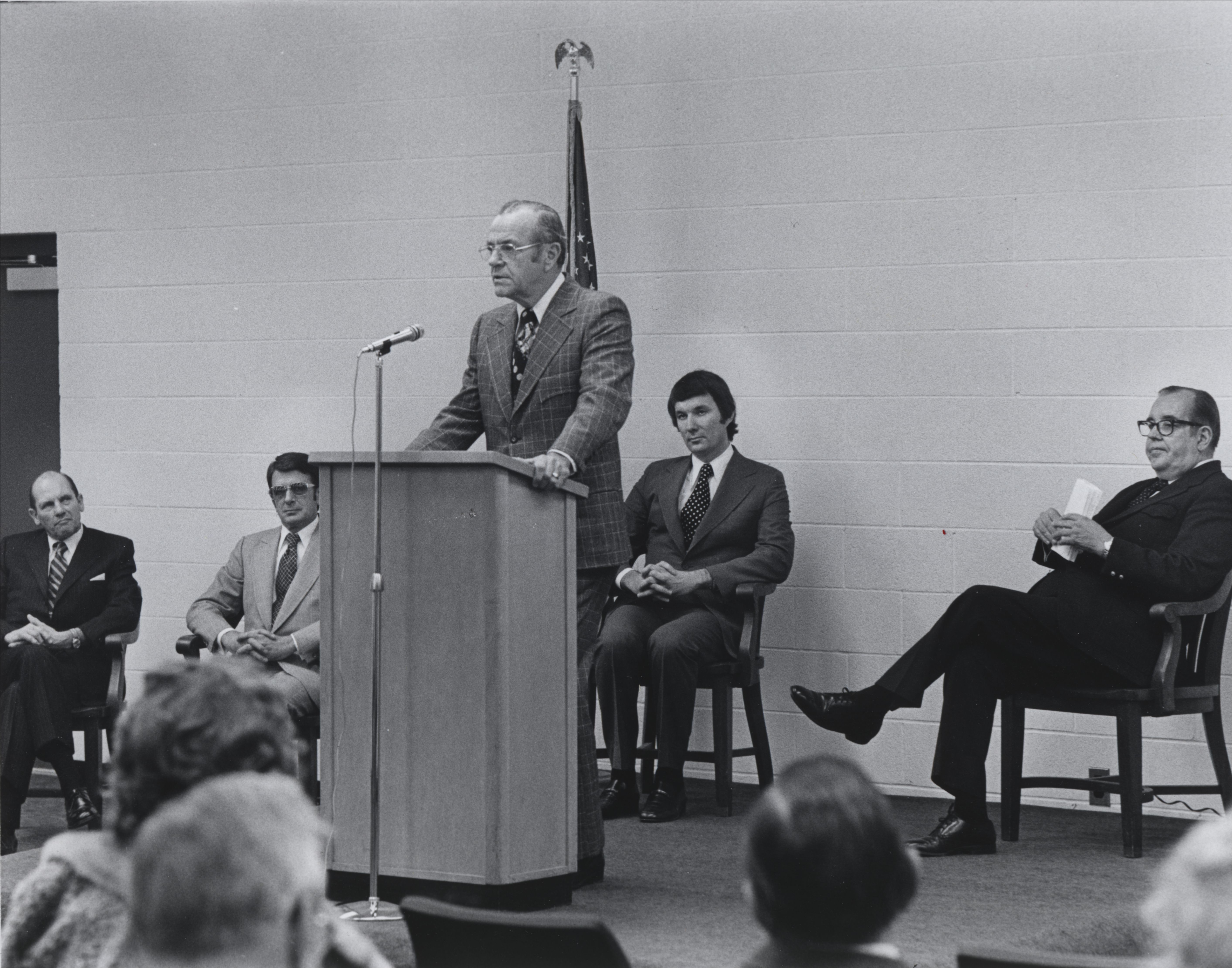 A man speaks at a podium while Jeff Barry (3rd President), Everett Hawley (Bd. of Trustees), and two other men sit on the stage behind him. Date unknown.