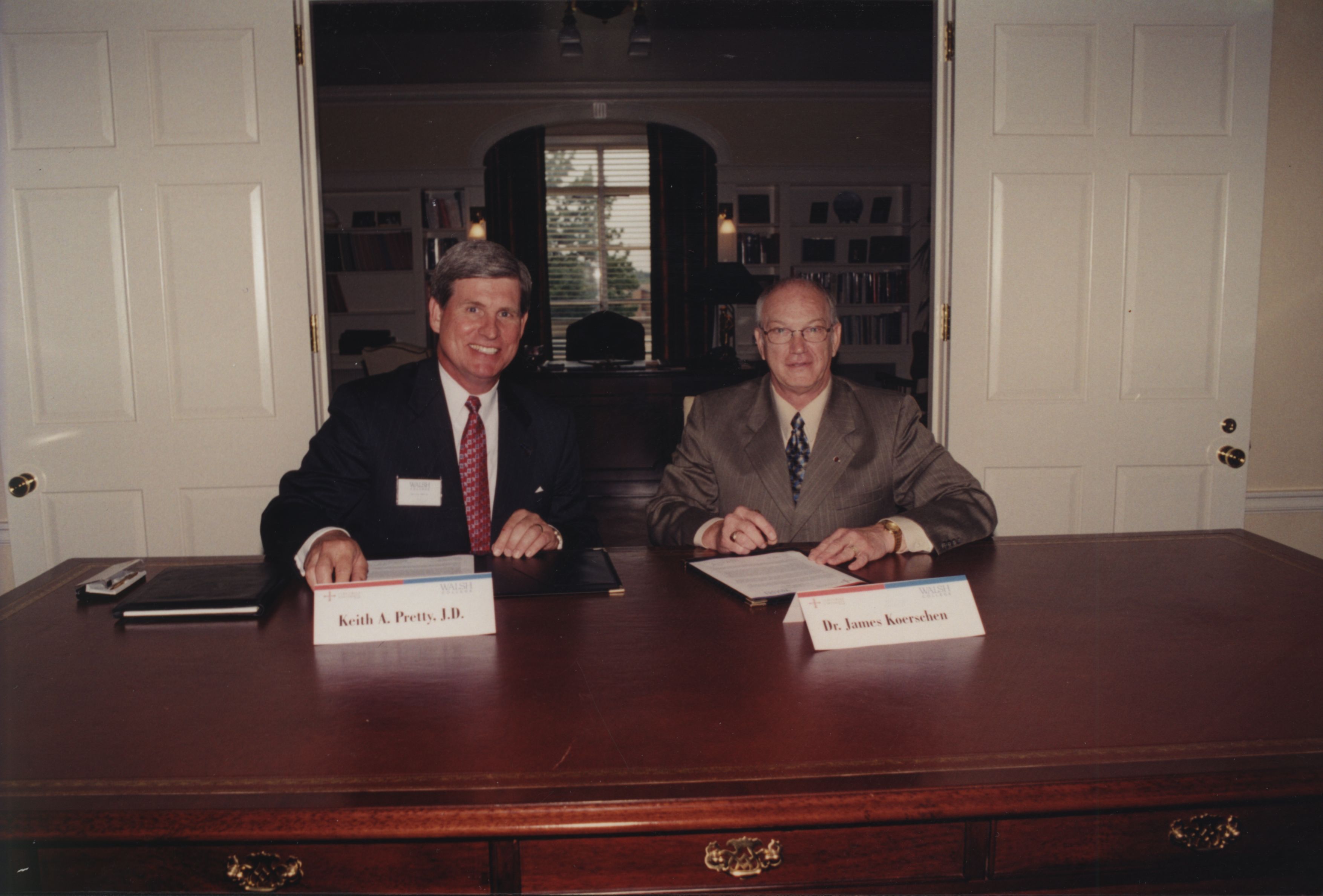 Keith Pretty (5th President) and James Koerschen, President of Concordia University, sign documents. Date unknown.