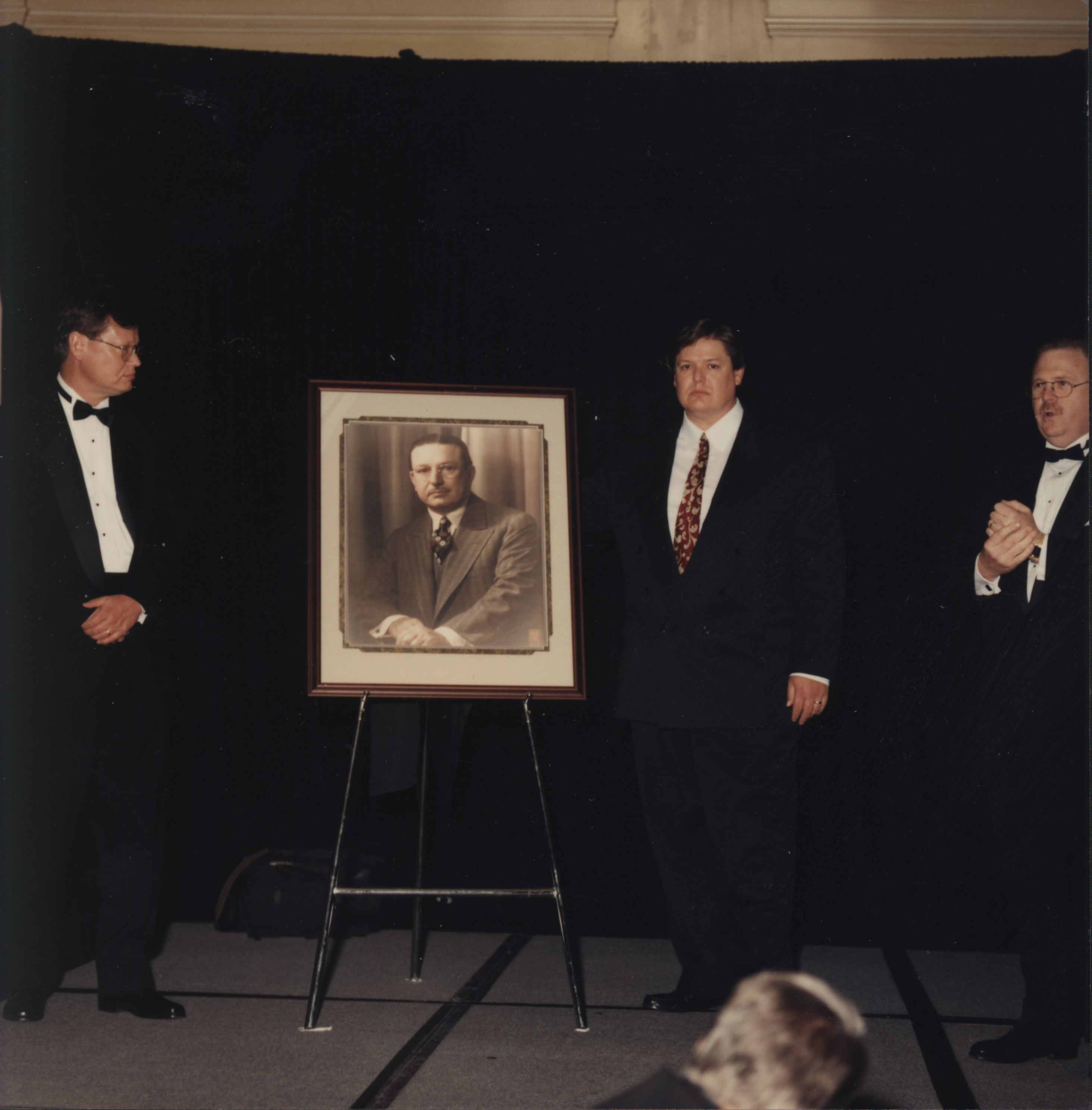 Dave Spencer (4th President), Mervyn B., and Mark Walsh at an unveiling of a portrait of the founder Mervyn Walsh. The portrait is currently in the Novi campus library. Date unknown.