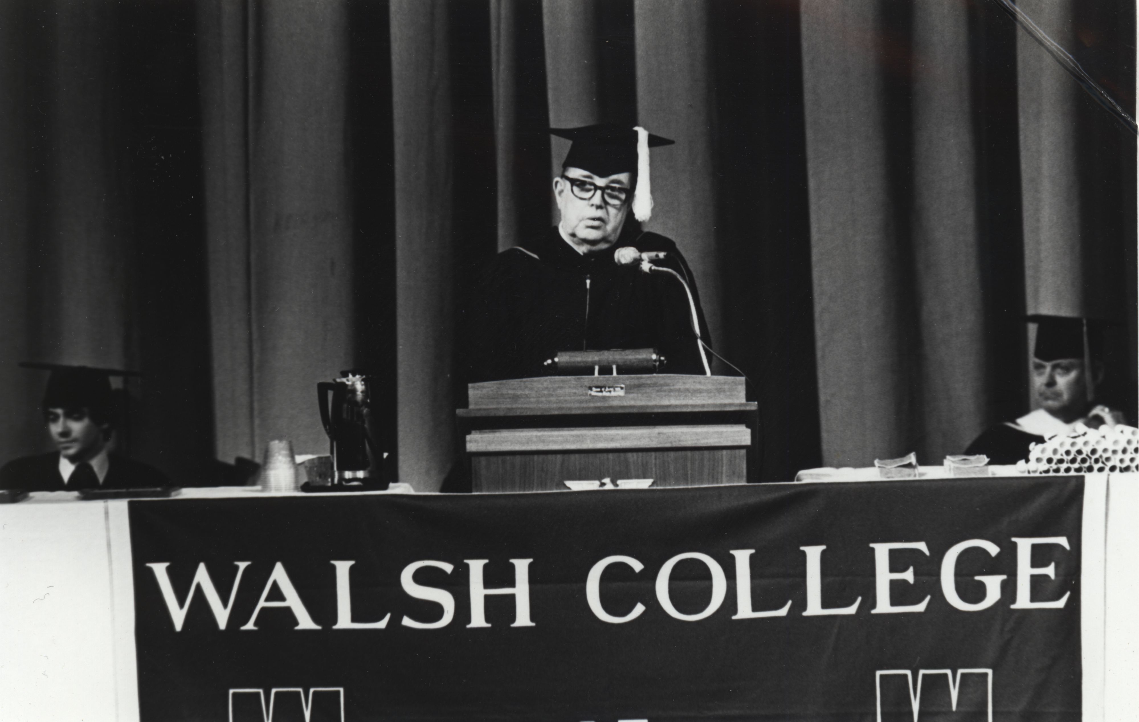 Everett Hawley (Bd. of Trustees) speaking at a commencement ceremony. Date unknown.