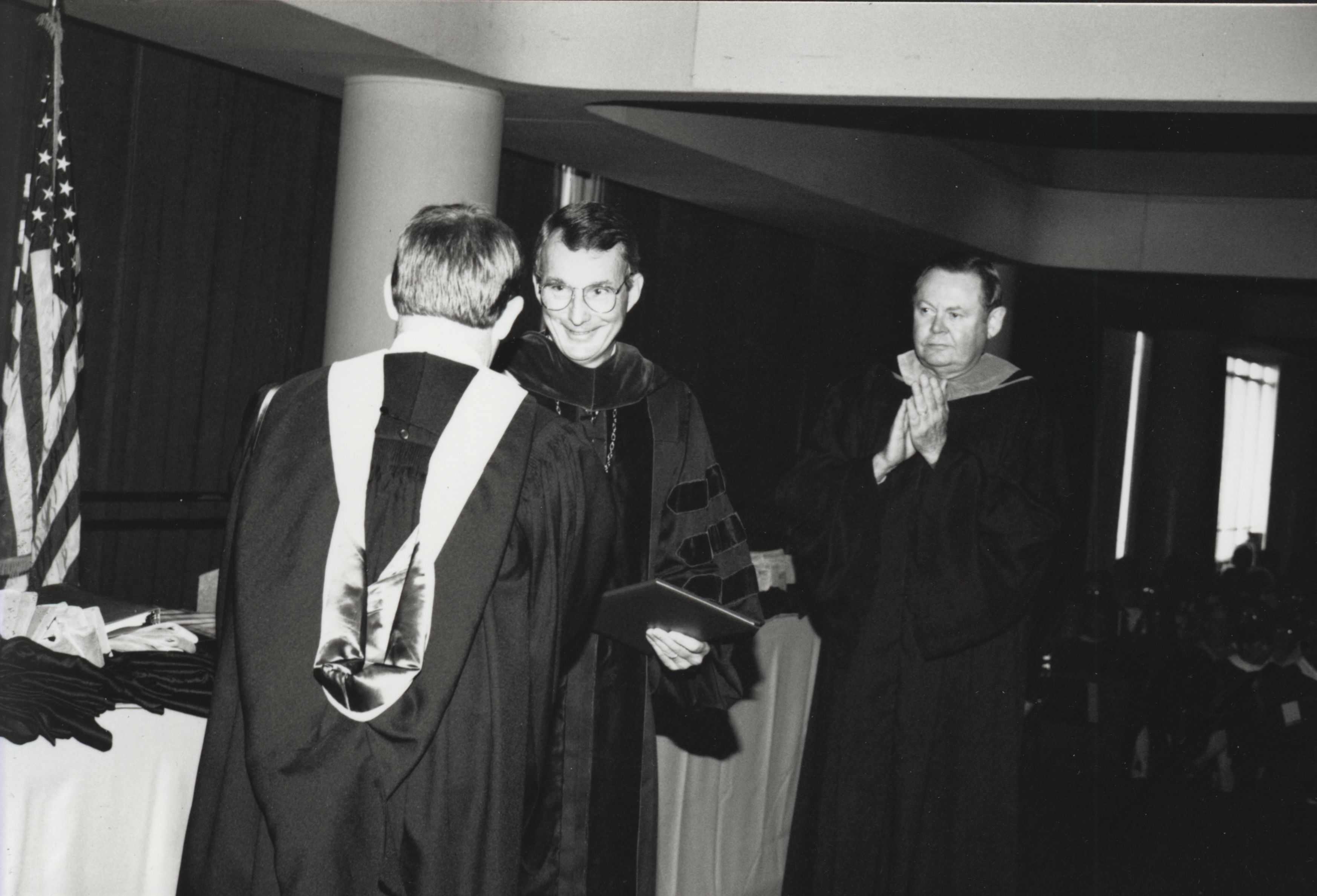 Jeff Barry (3rd President) hands shakes a man's hand while Walter Fisher (Bd. of Trustees) claps behind him. Date unknown.