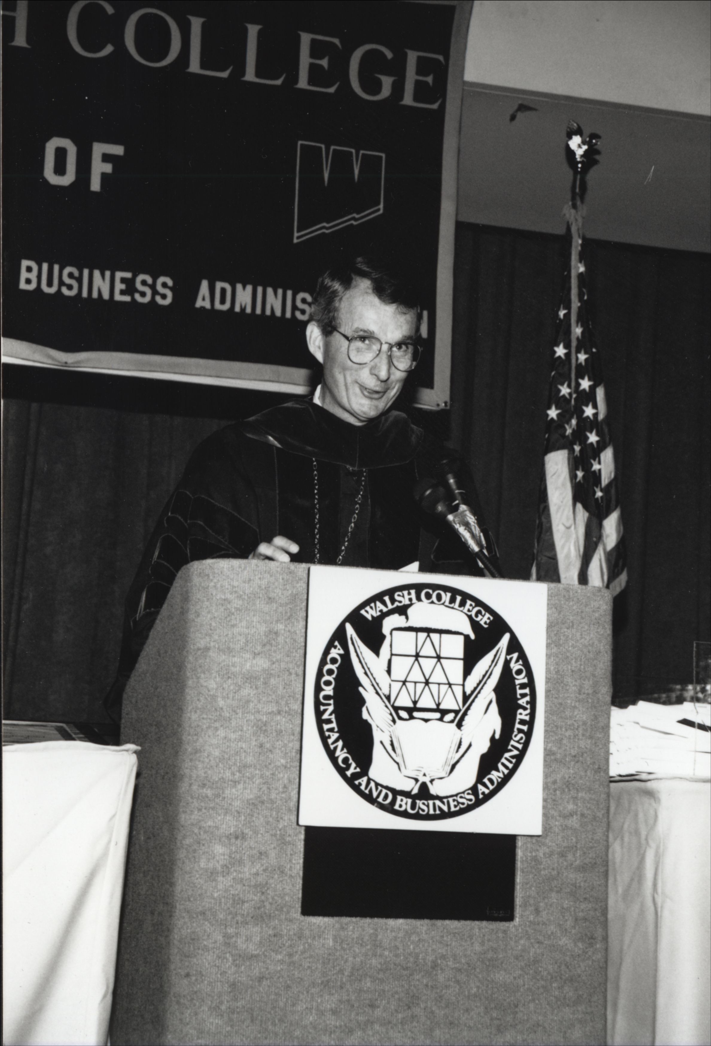 Jeff Barry (3rd President) speaks at the podium at a commencement ceremony. Date unknown.