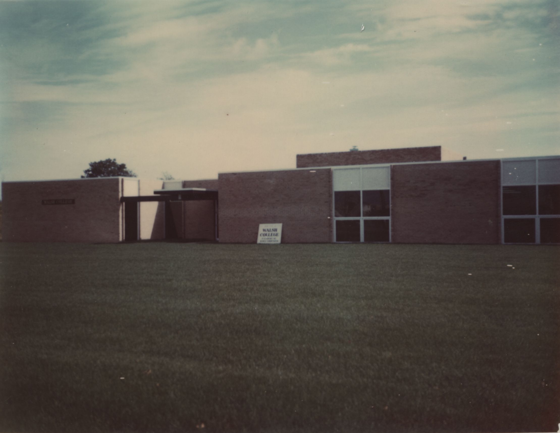 An exterior side of the Troy Campus with a sign for Walsh College propped up against it. (date unknown)