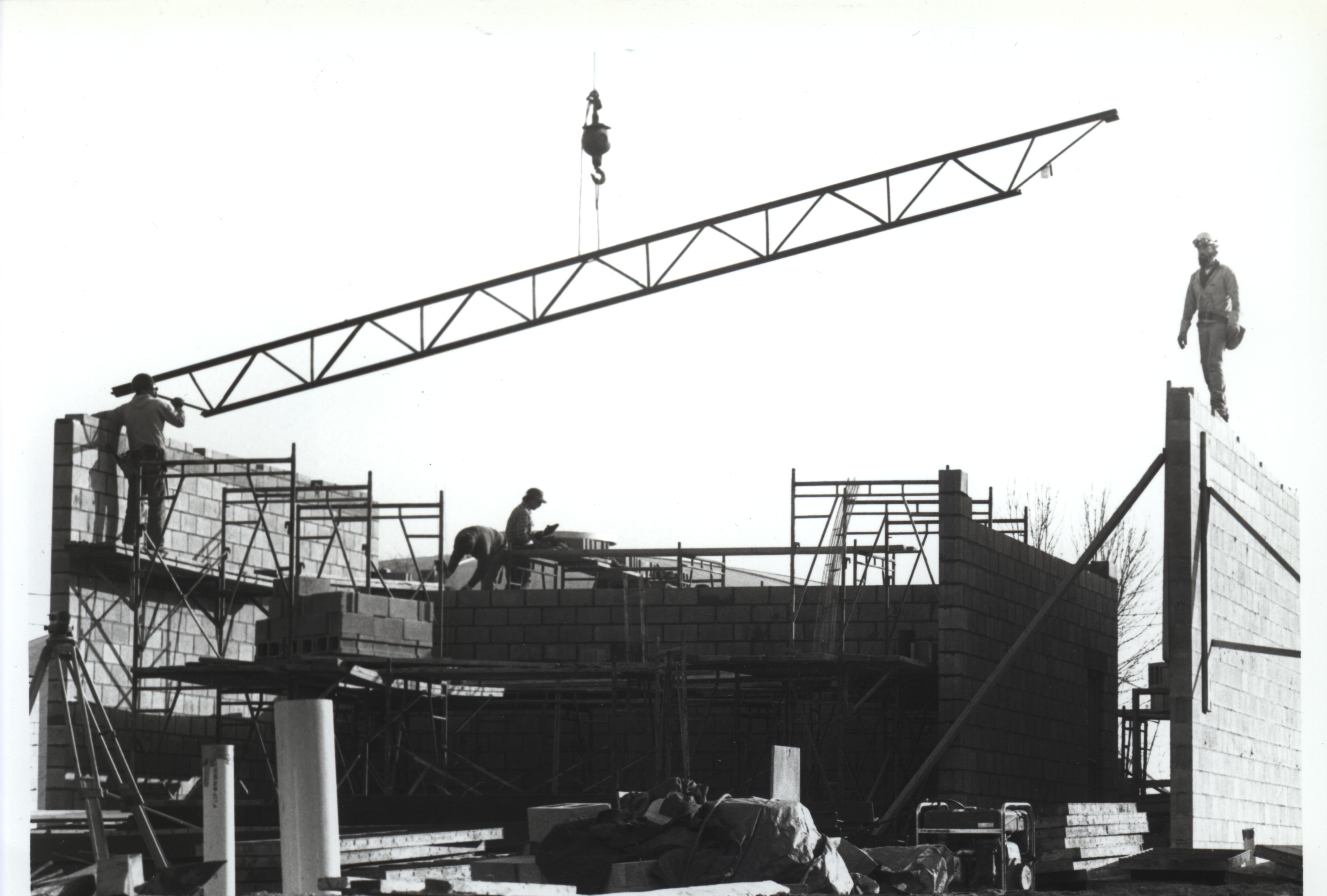 Construction to the new building addition to the Troy Campus (1990s, exact date unknown) We're right on schedule! (from back of photo)