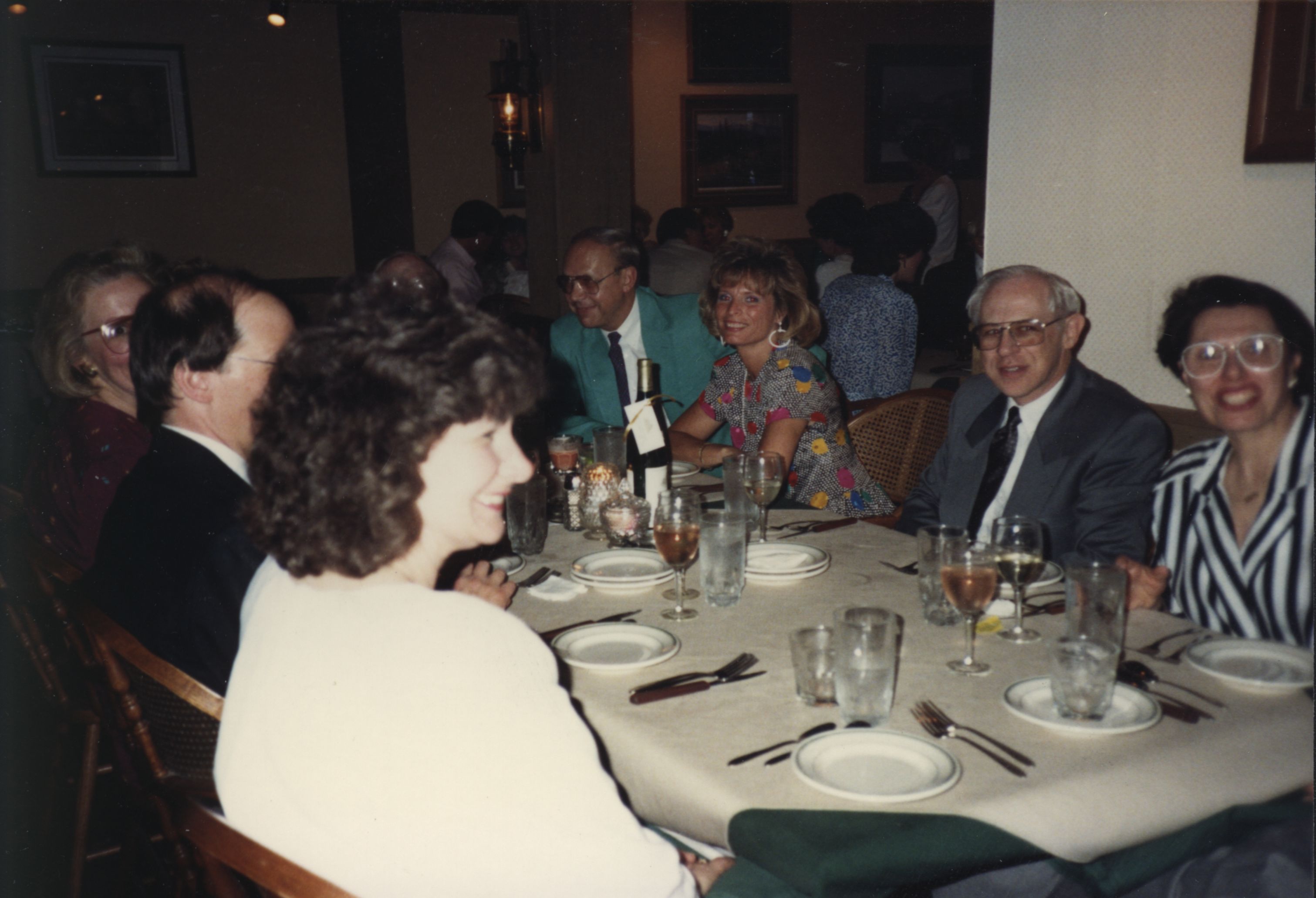 Communications Professor Barbara Alpern, her husband Irwin, and group of people at dinner.