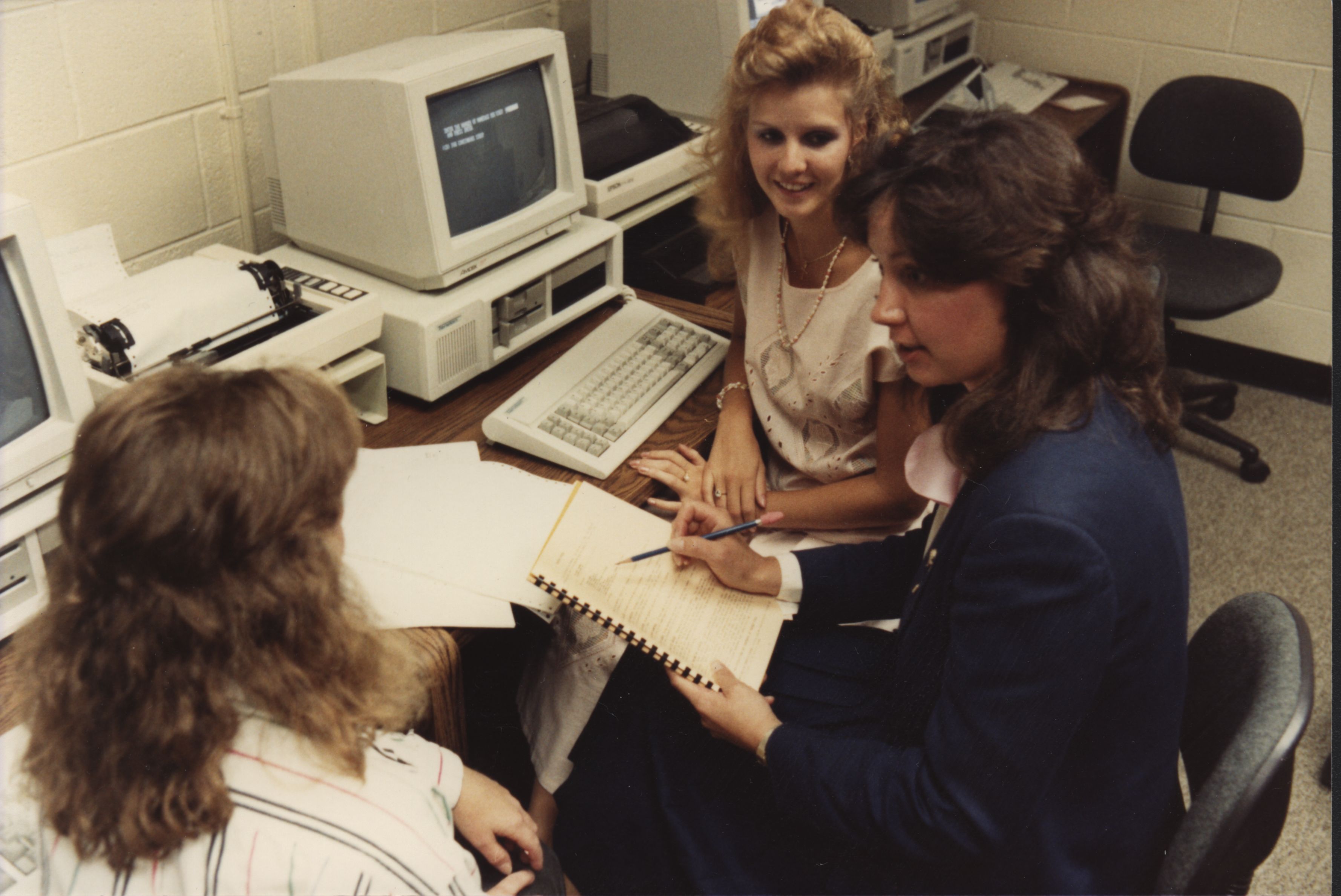 Finance and Economics Professor Linda Wiechowski helping two students. (date unknown)