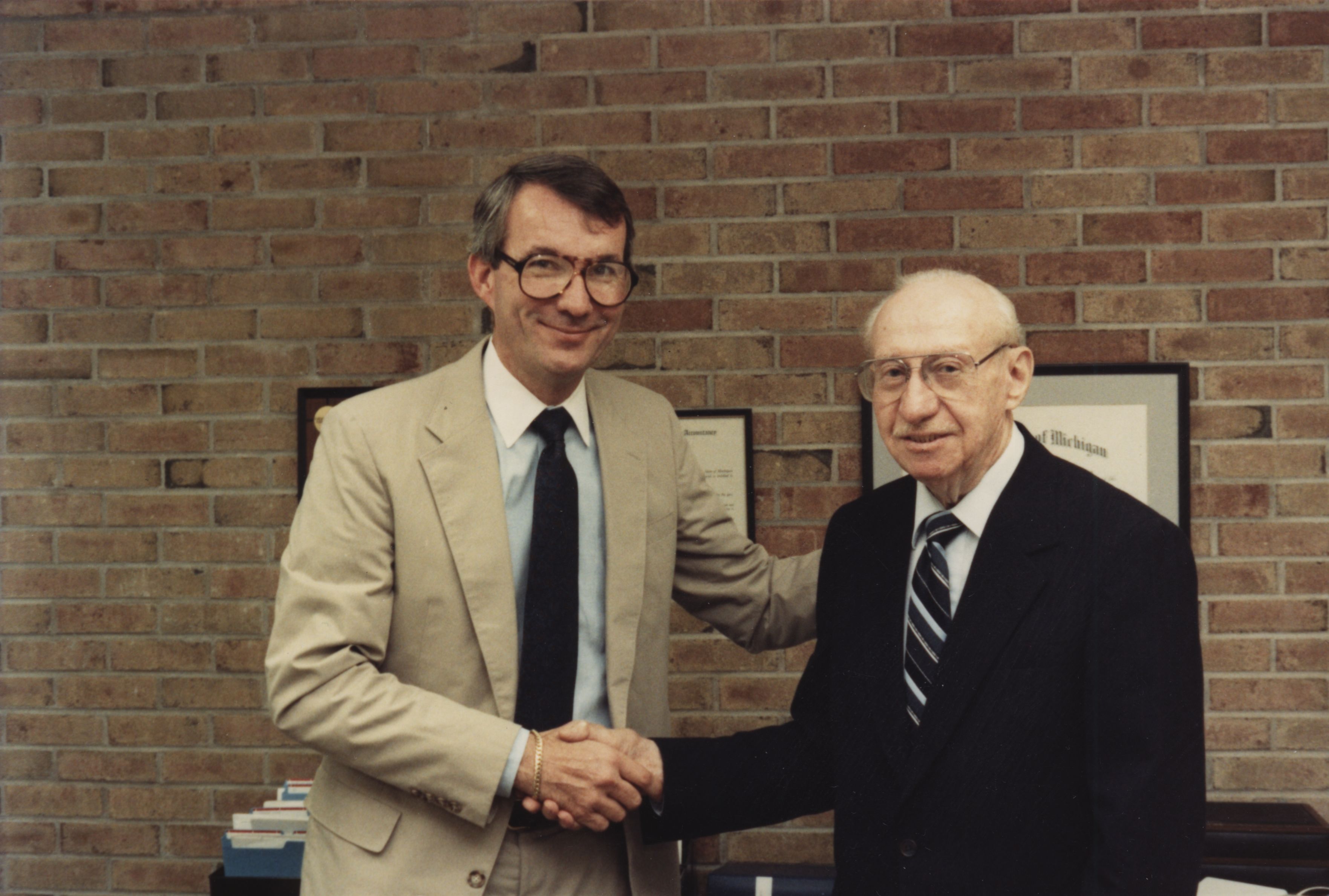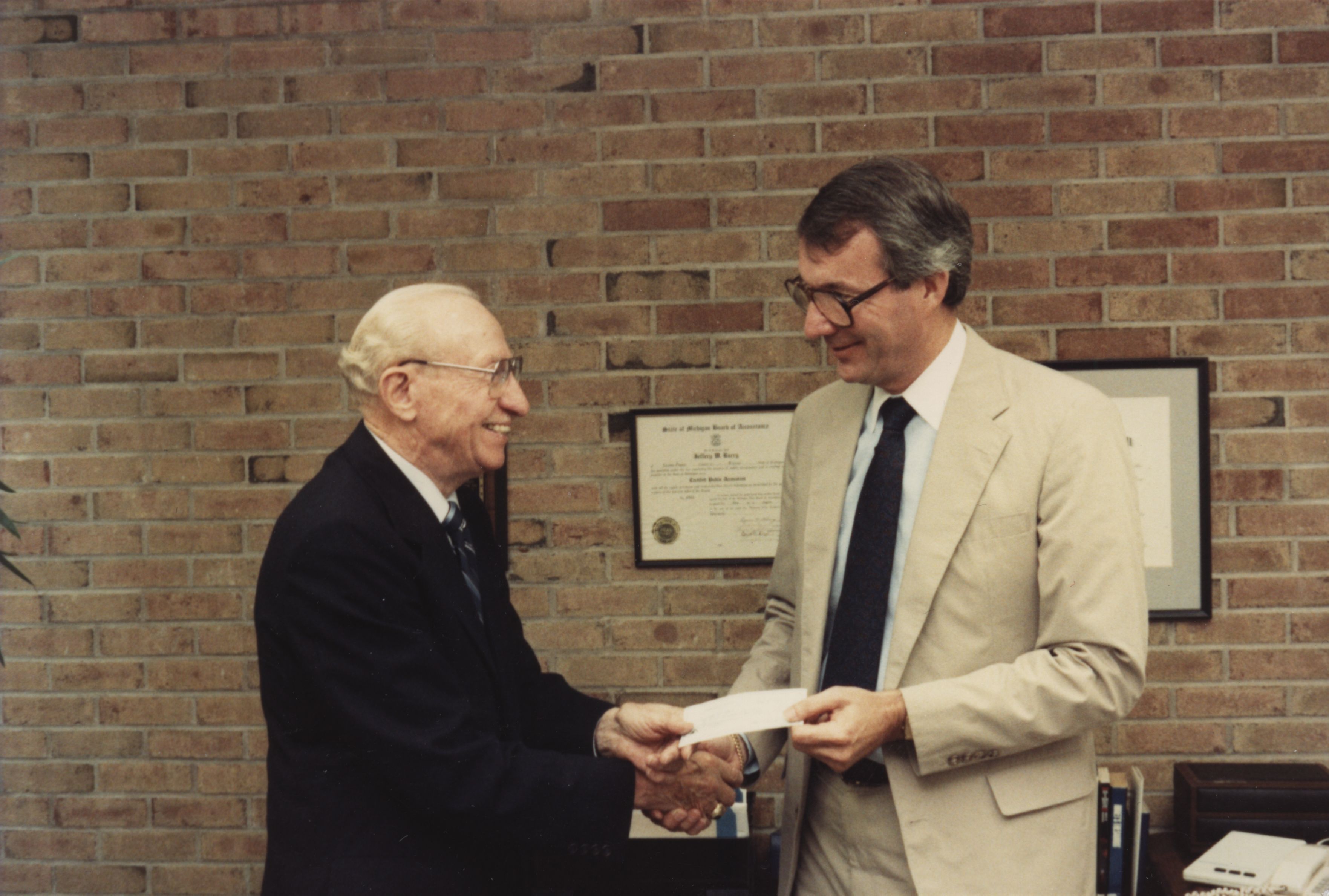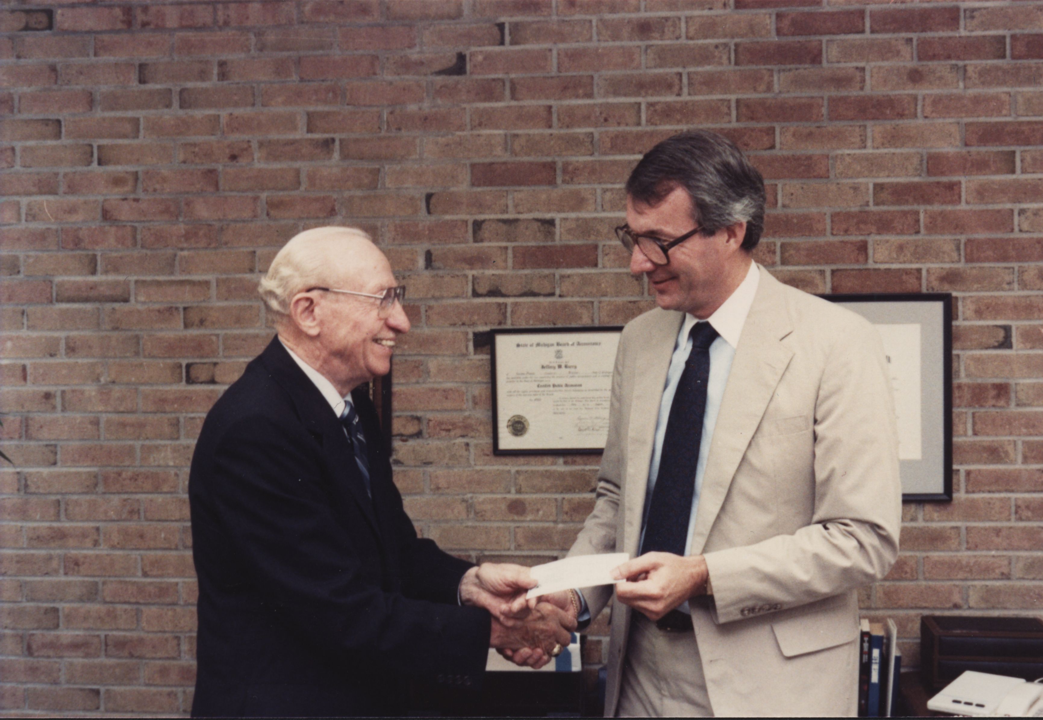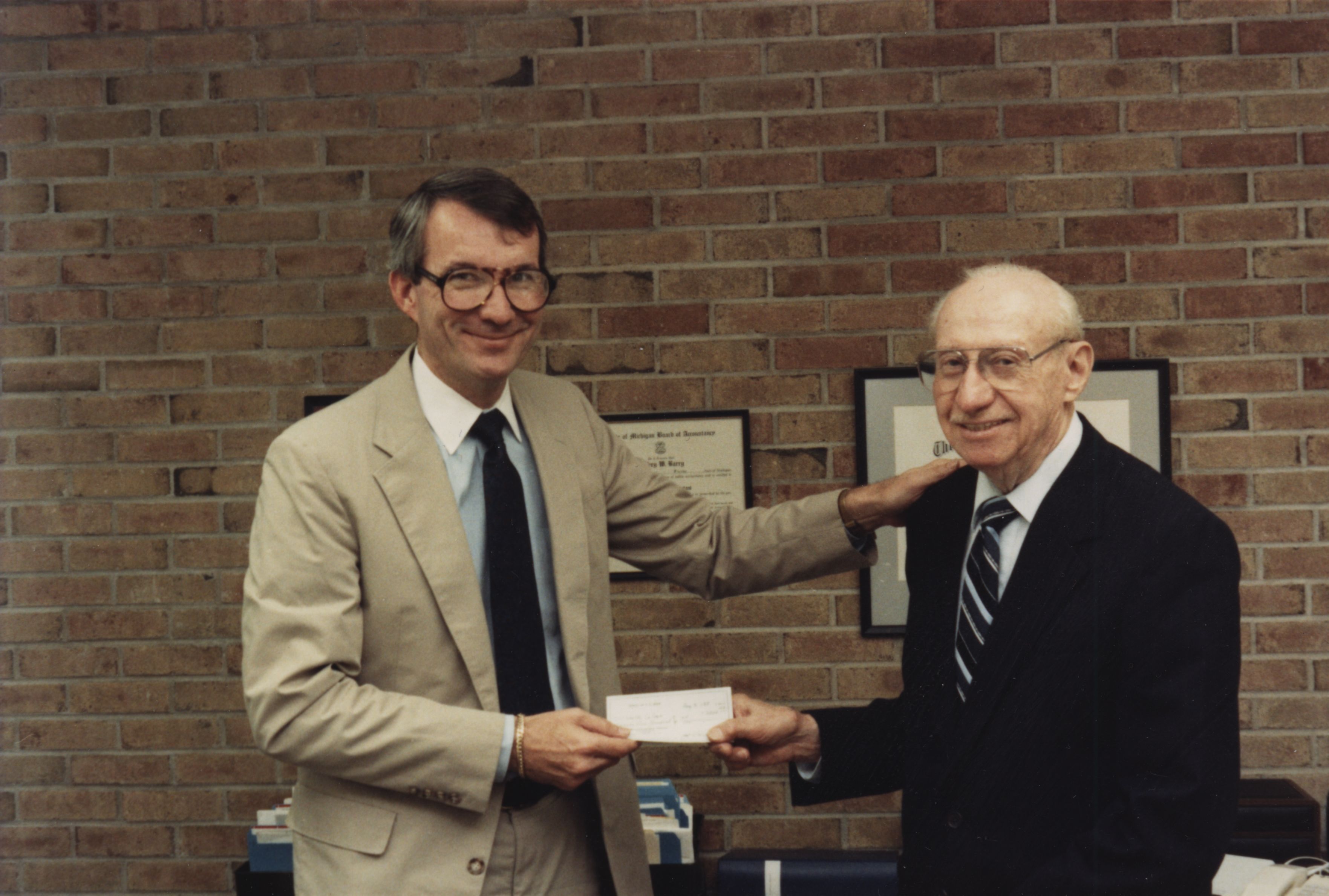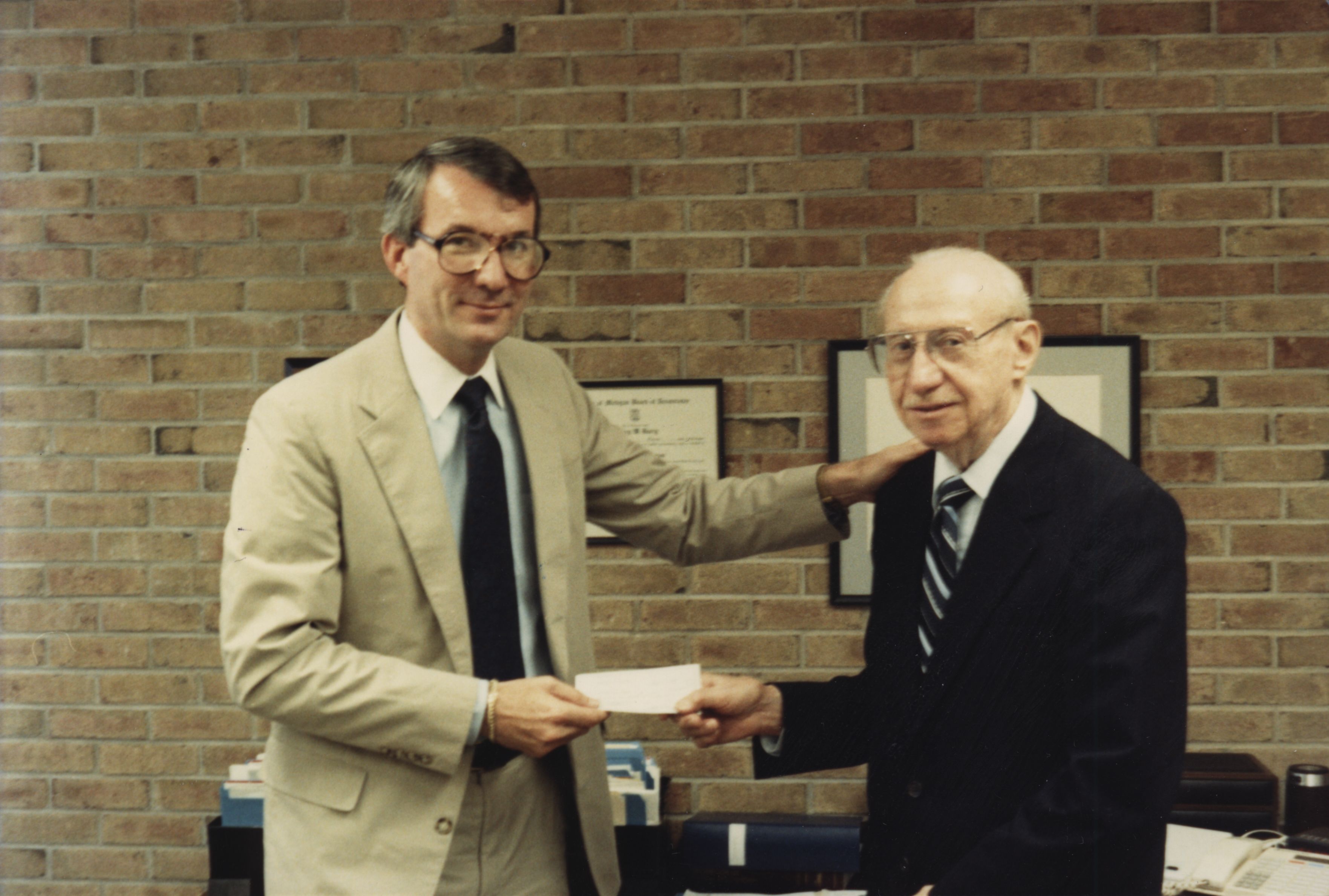 QM and Management Professor Ernie Shaw exchanges a check with Jeff Barry (3rd President). (date unknown)