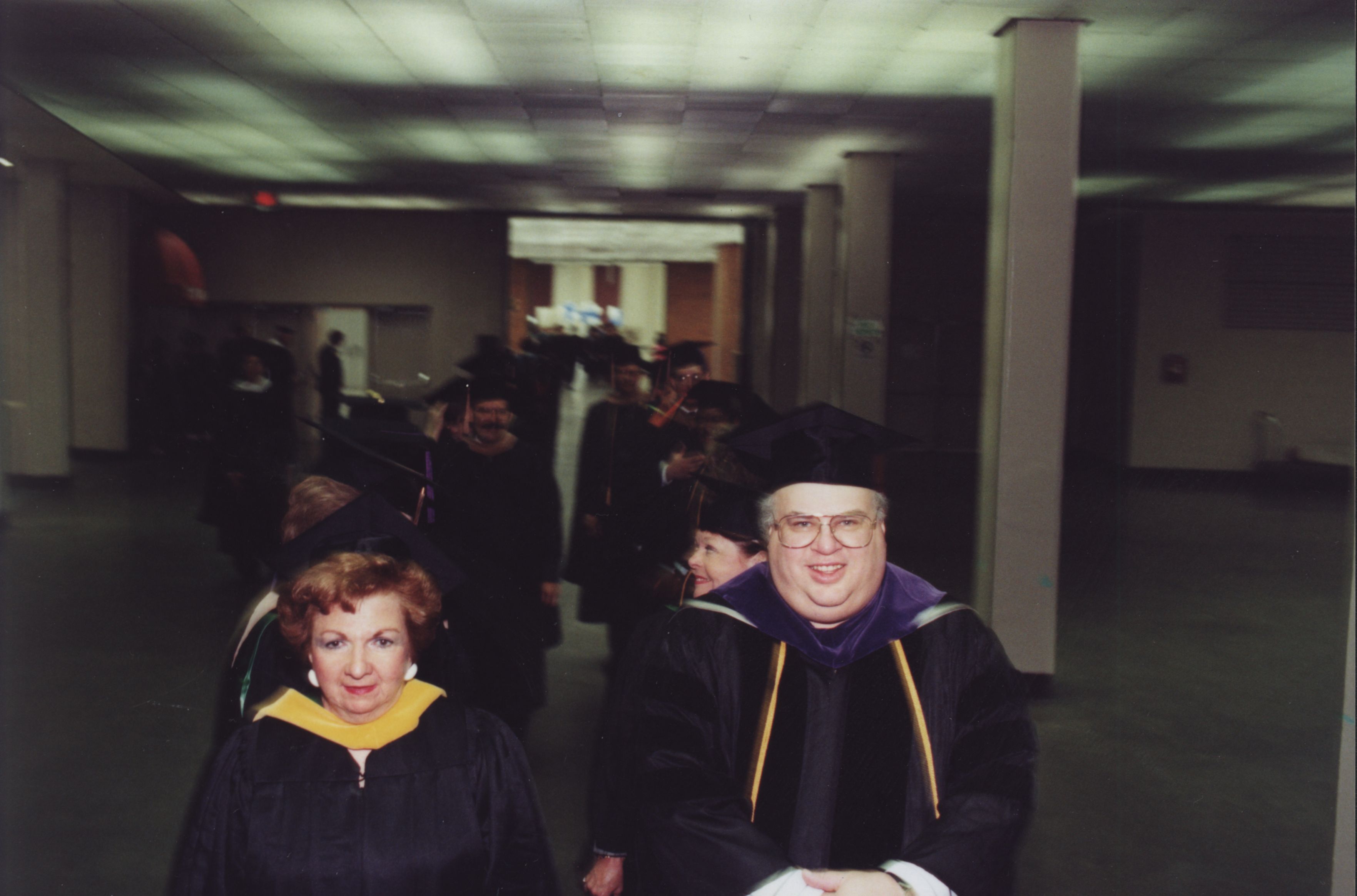 Mark Solomon, Gloria Ellis Librarian (from back of photo) Mark Solomon and Gloria Ellis in the procession line at commencement. (date unknown)
