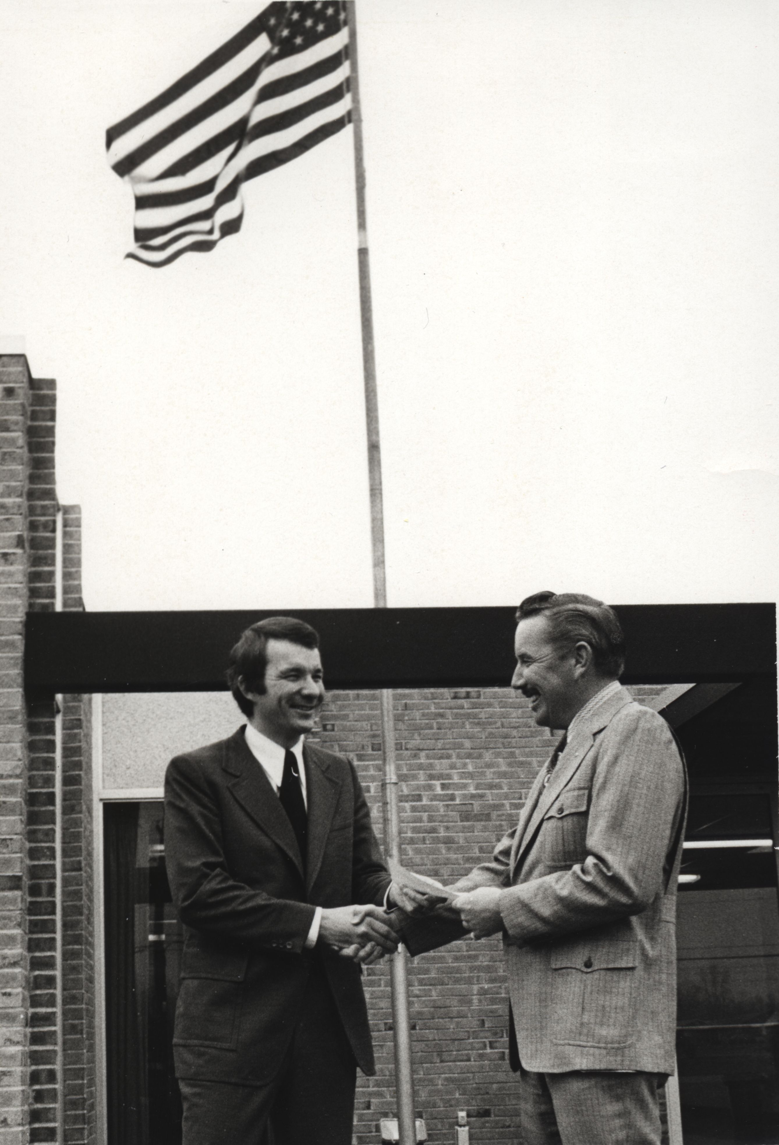 Jeff Barry (3rd President) and another man shake hands outside in front of an American flag. (date unknown)