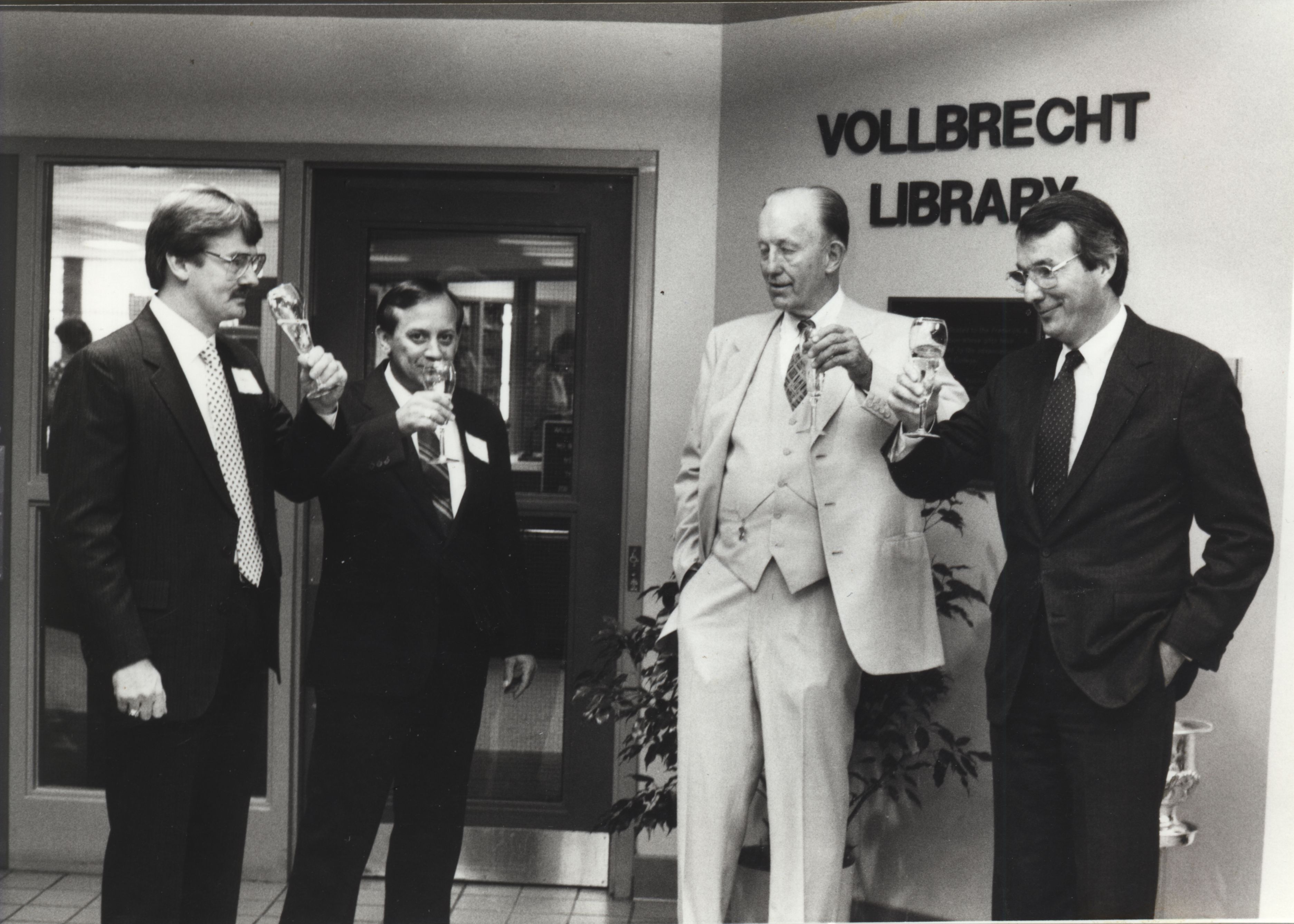 Jeff Barry (3rd President) and three other men make a toast outside the Vollbrecht Library. (date unknown)