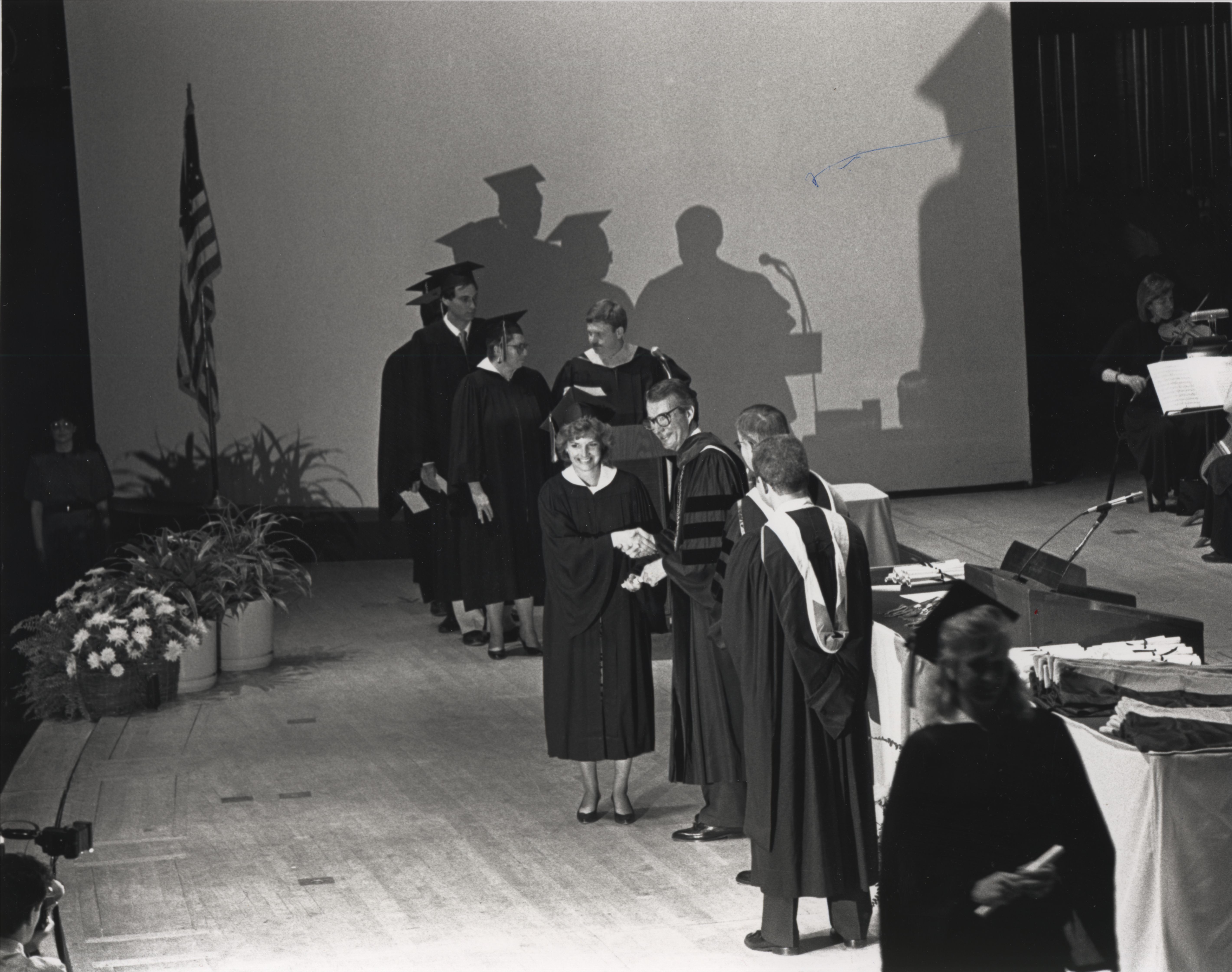Jeff Barry (3rd President) shaking a student's had on stage at commencement. (date unknown)