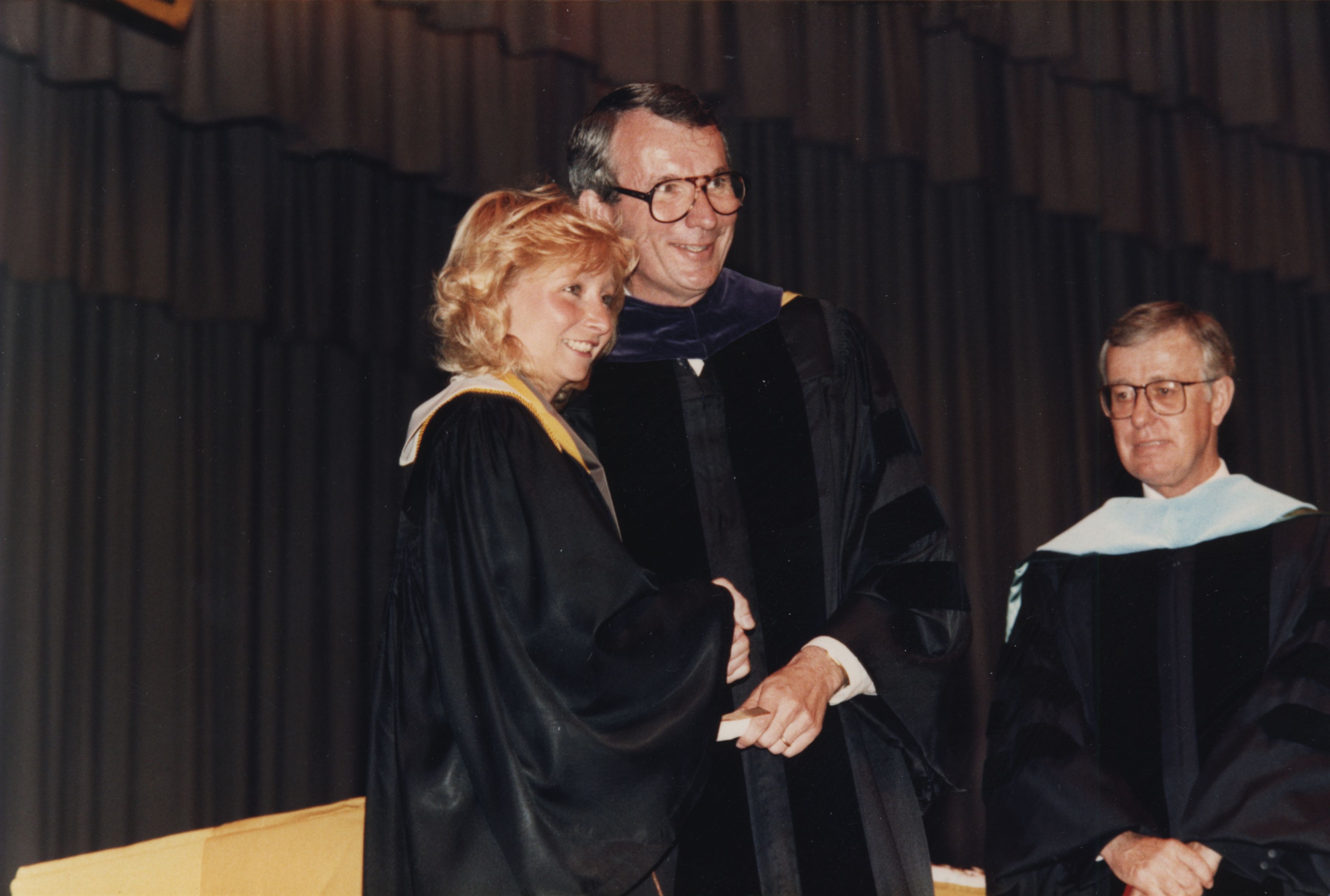 Jeff Barry (3rd President) shakes a woman's had at a commencement ceremony. (date unknown)