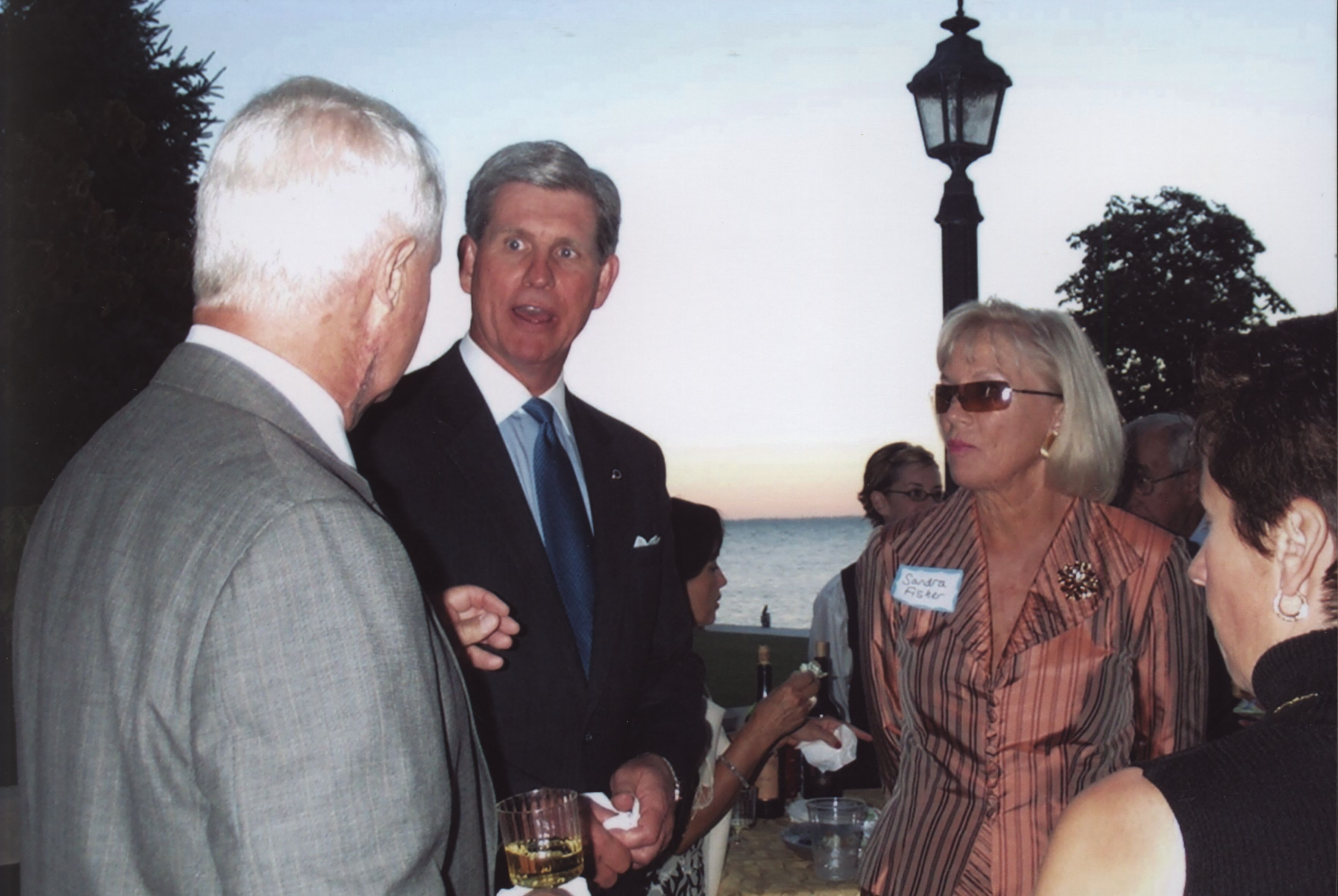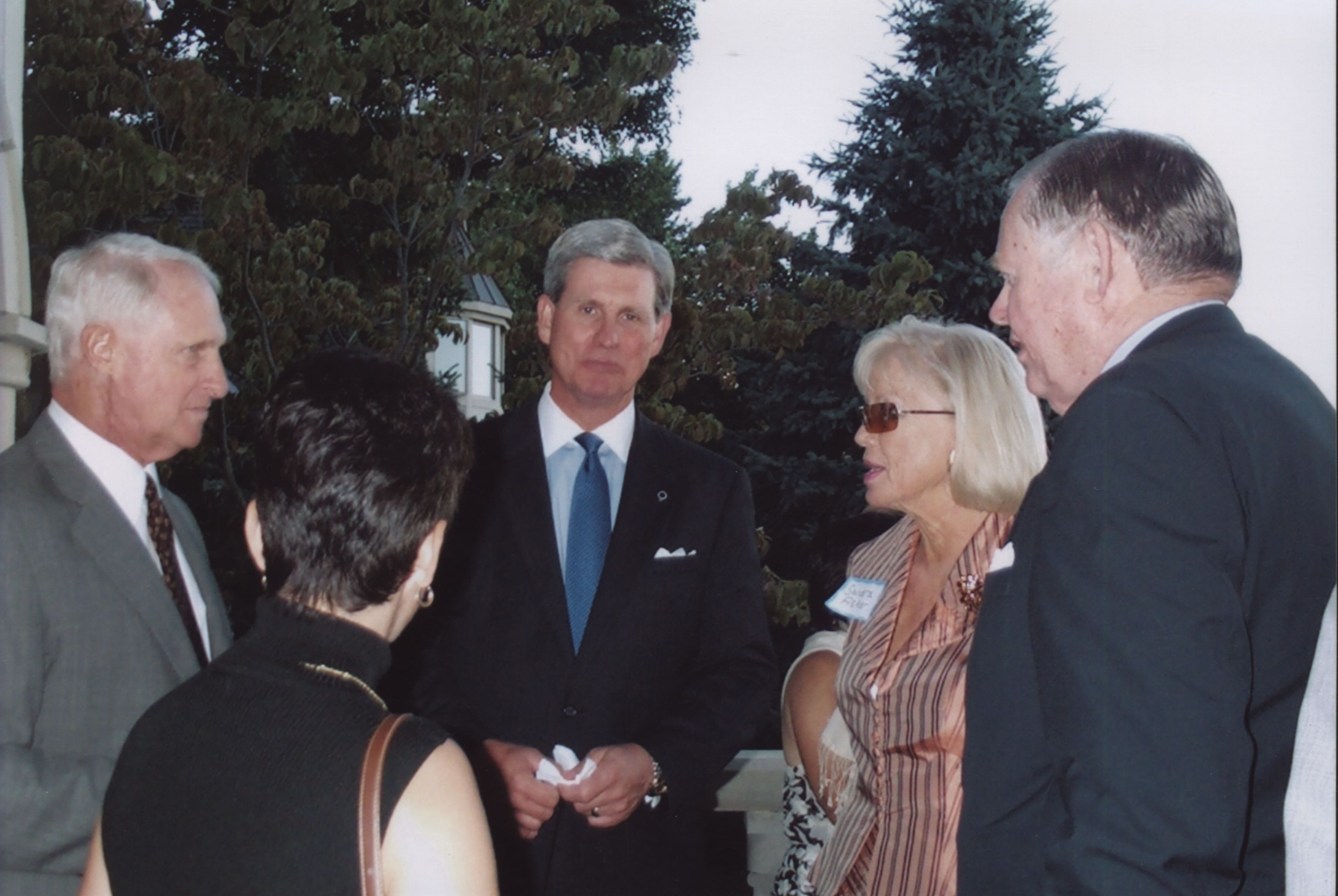 Keith Pretty (5th President) talking with Stephen Horn, Sandra Fisher, and a group of people. (date unknown)