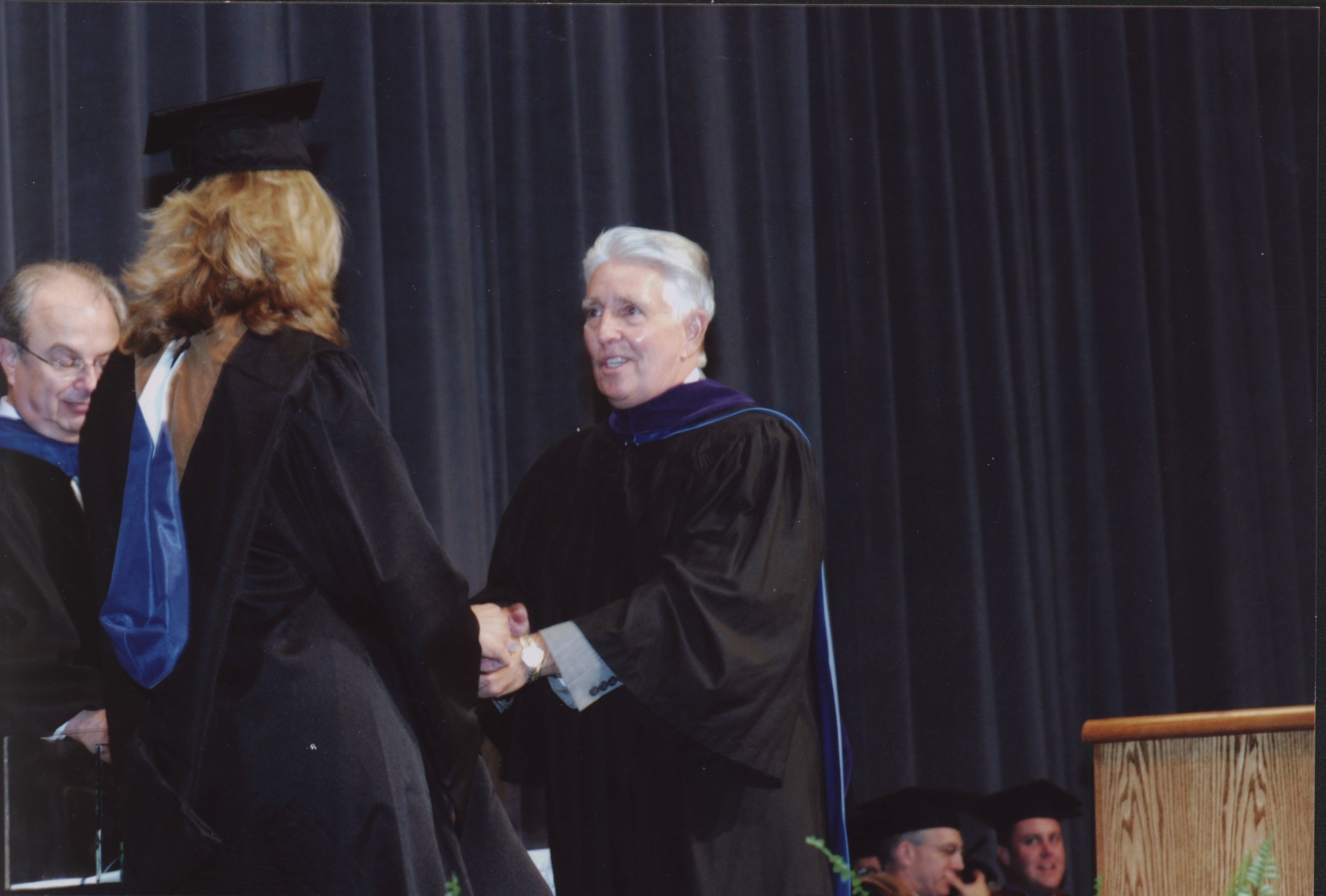 Image 5: Richard Pearson shakes a woman's hand at commencement.
