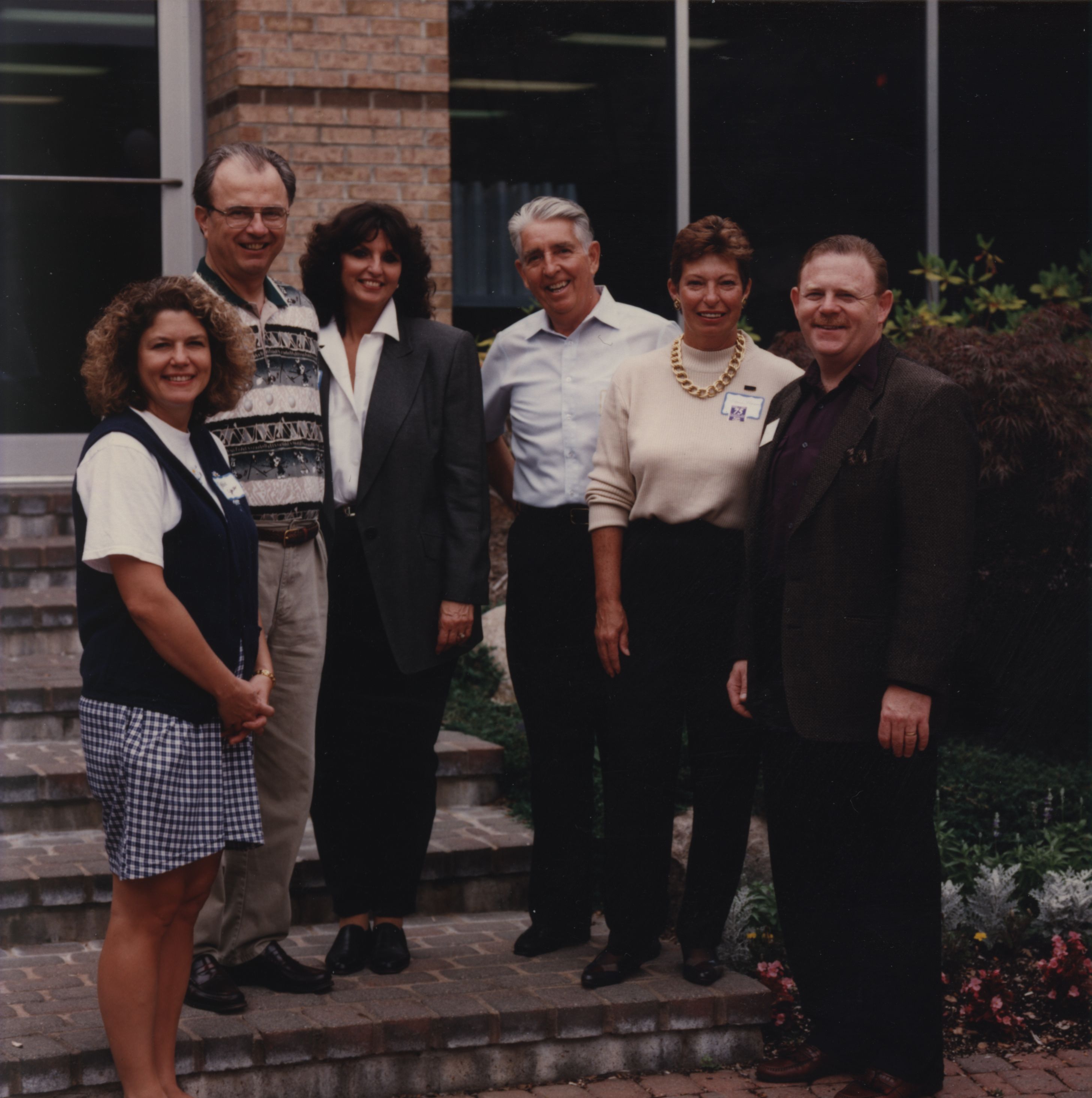 Richard Pearson, Elaine Pearson, Dave Spencer (4th President), Debbie Spencer, and two other people outside Walsh. (date unknown)