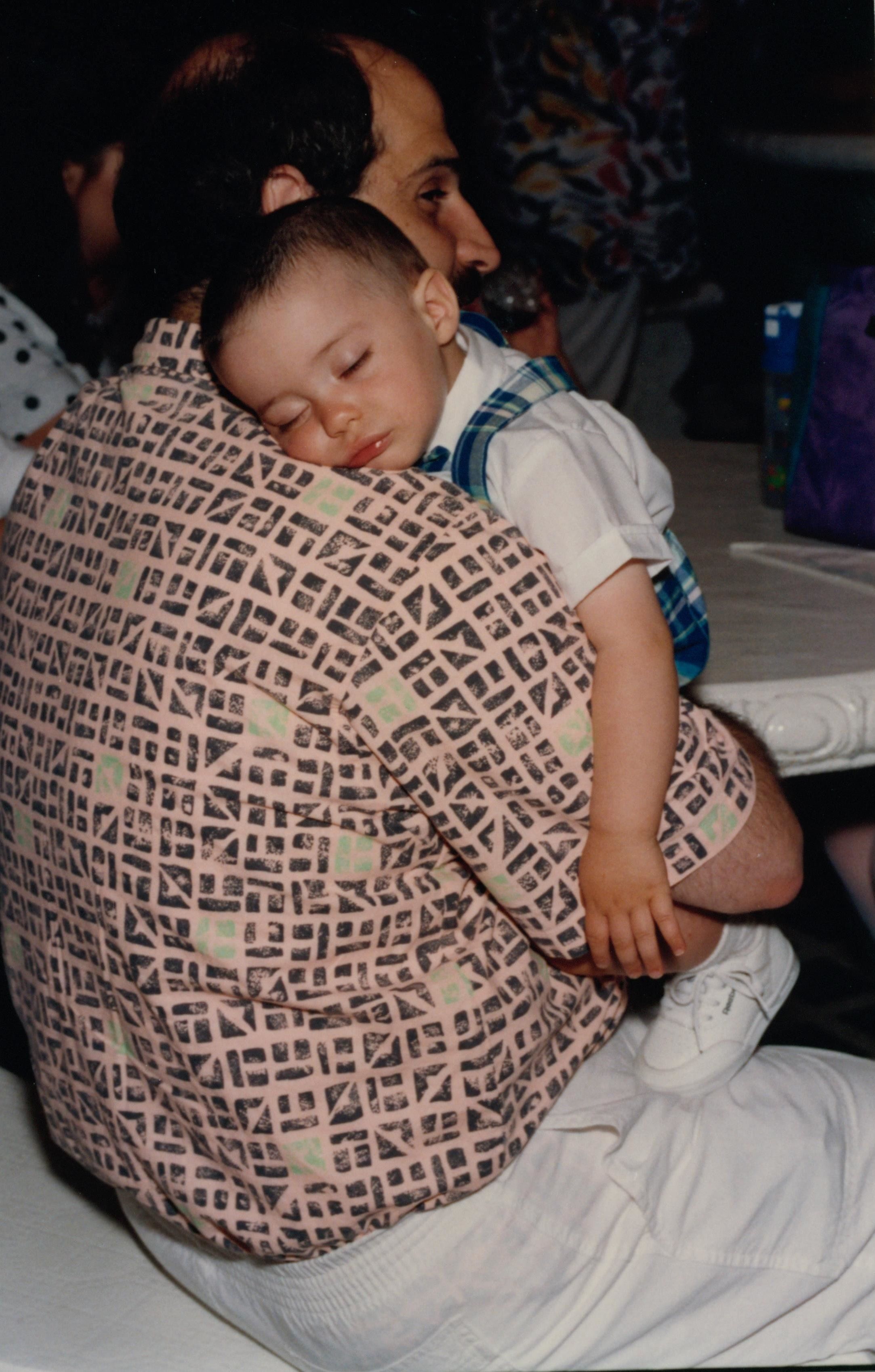 A man holds a sleeping child at commencement.