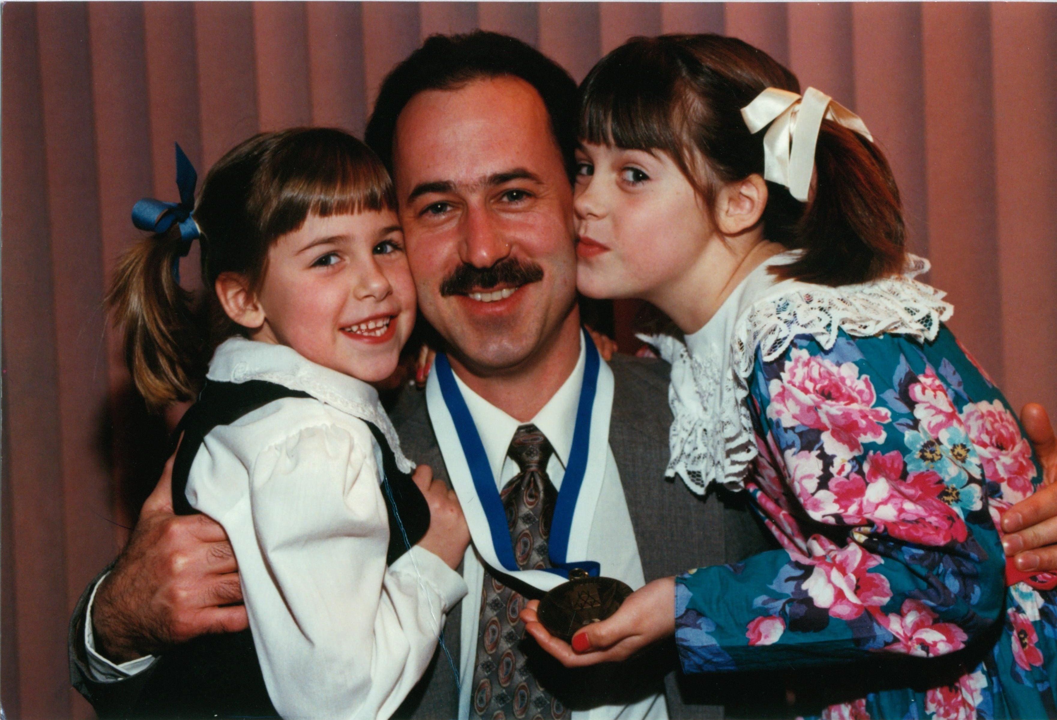A graduating dad is congratulated by his proud daughters after the Winter 1995 honors convocation. (from back of photo, pg. 231C in Walsh history book)