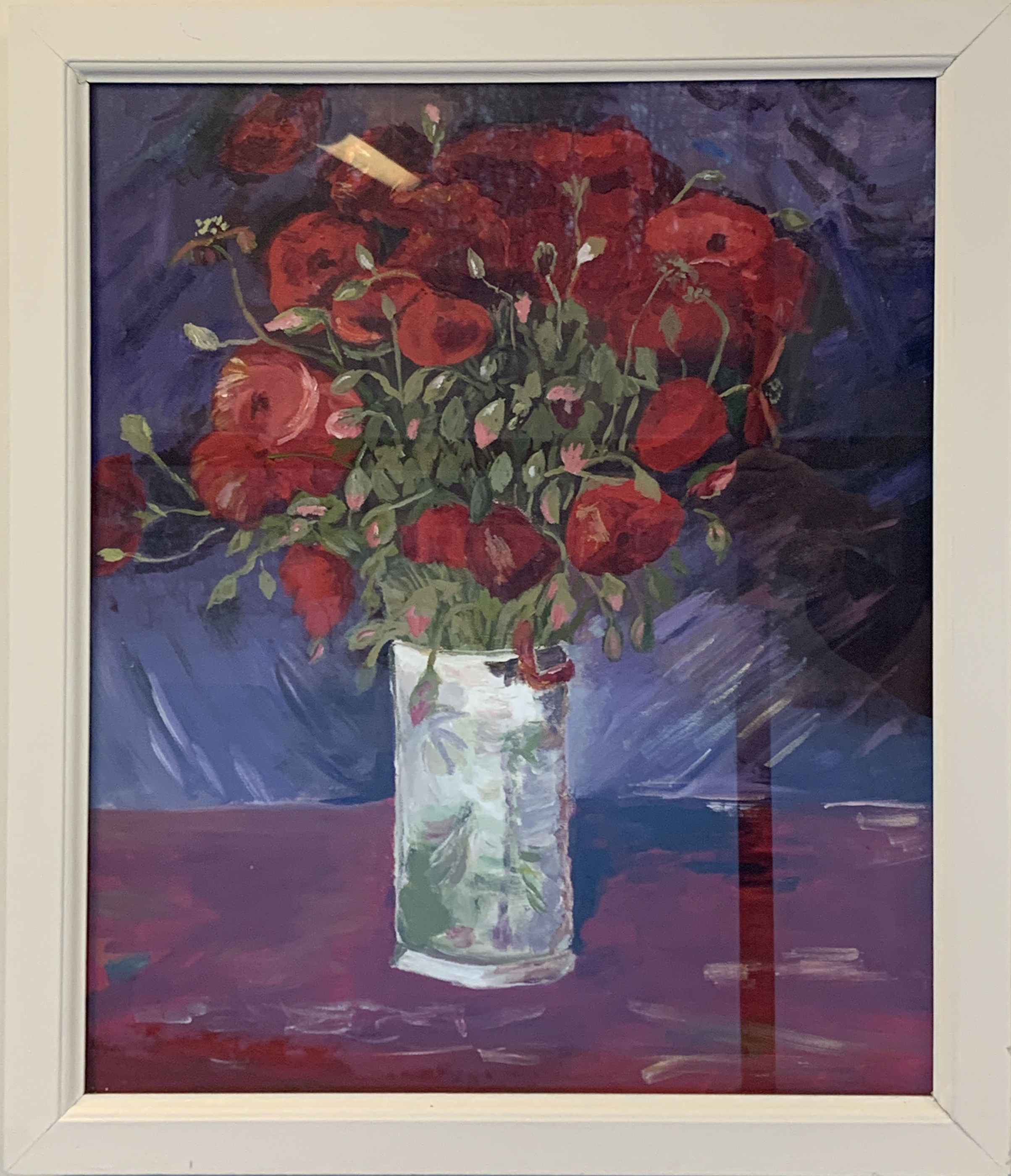 Vase containing red flowers on a purple and red background