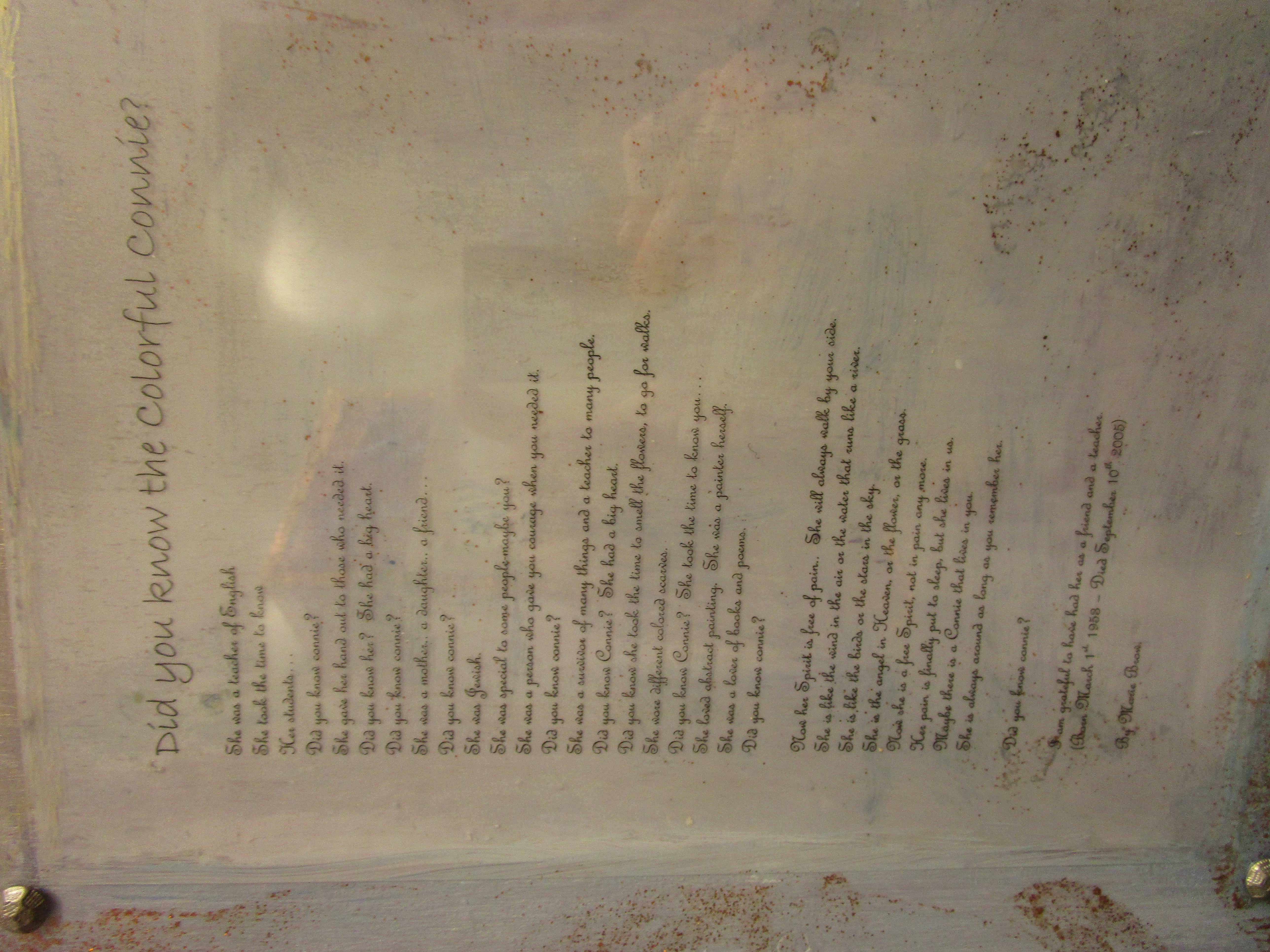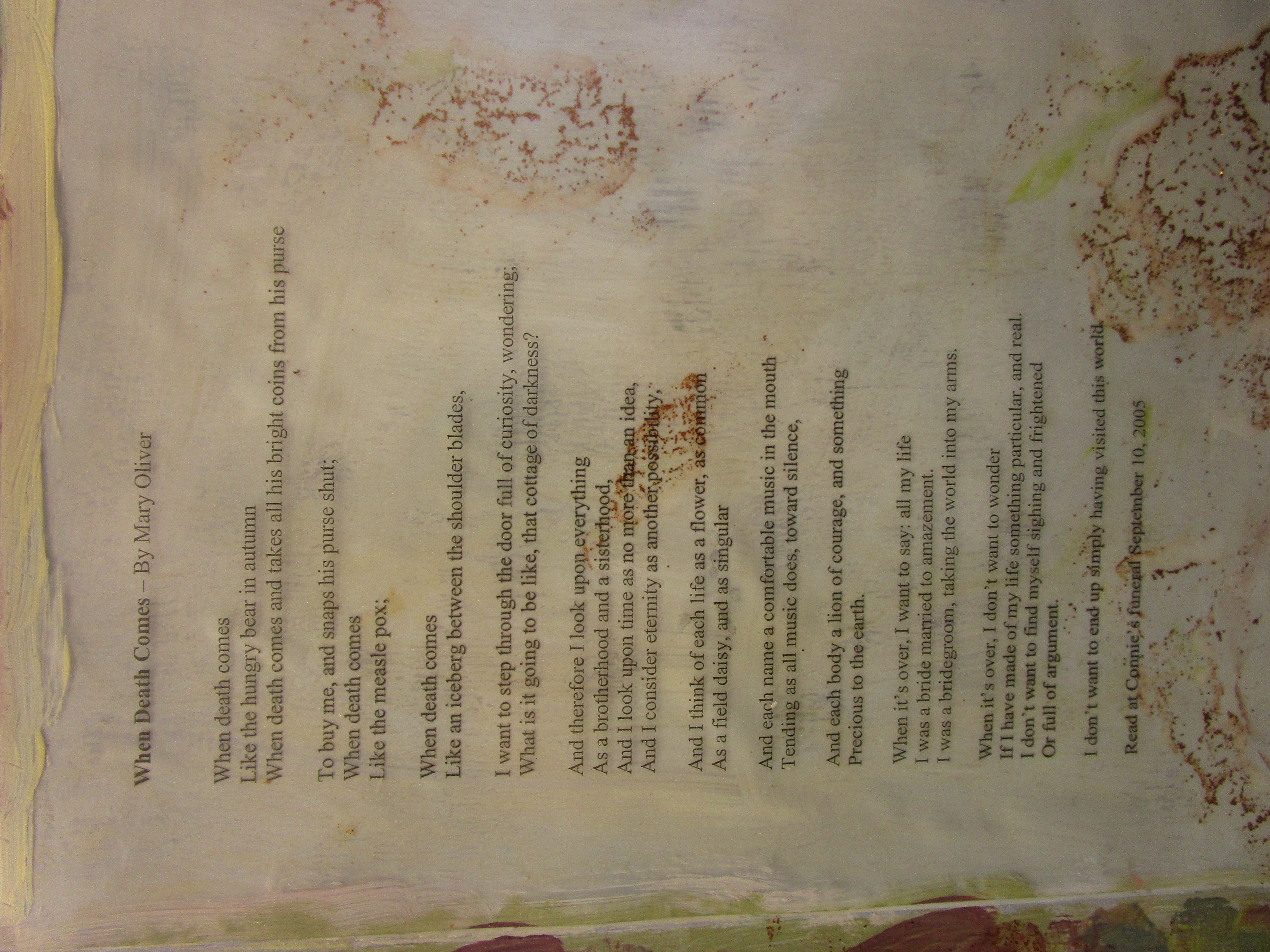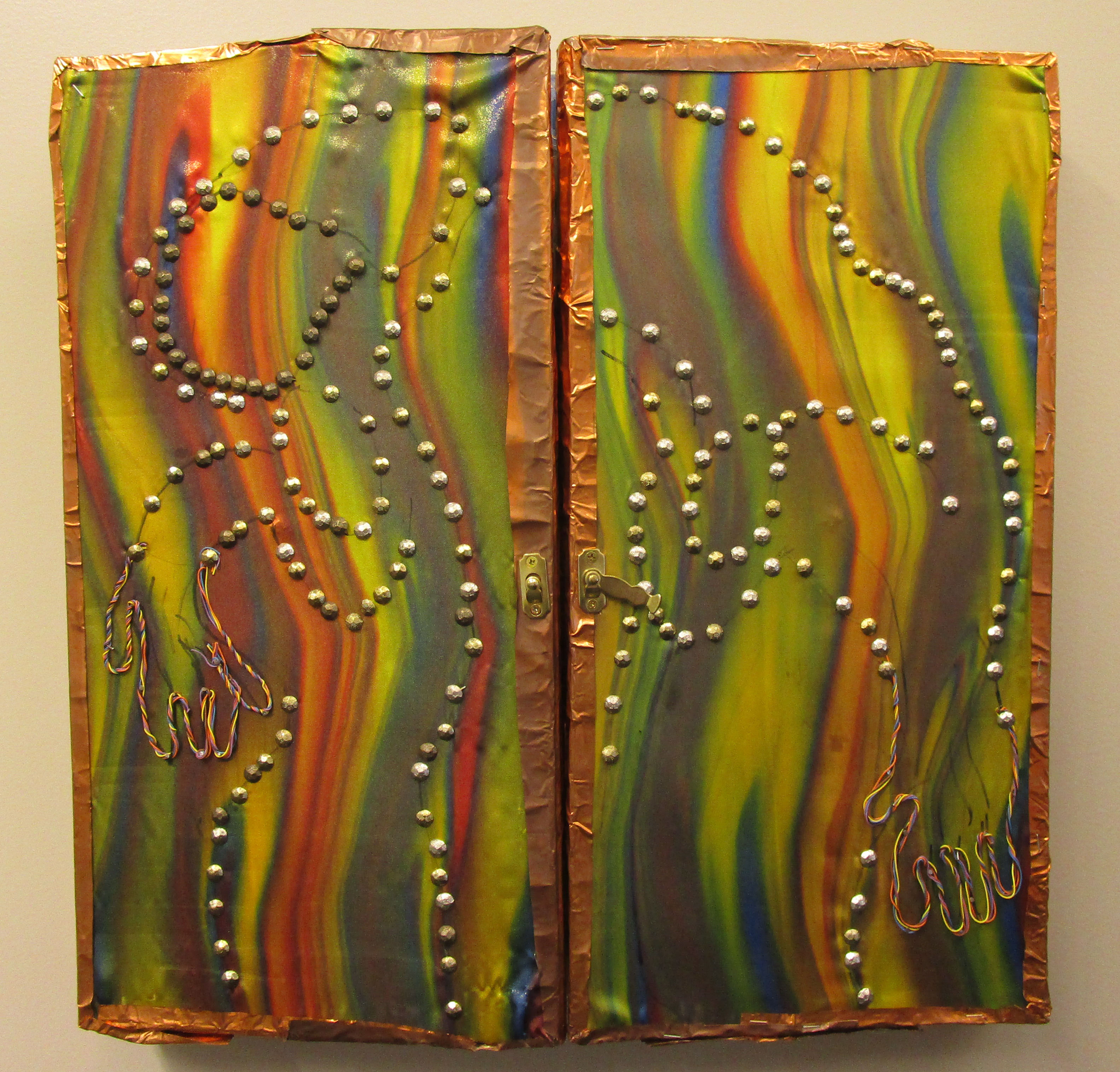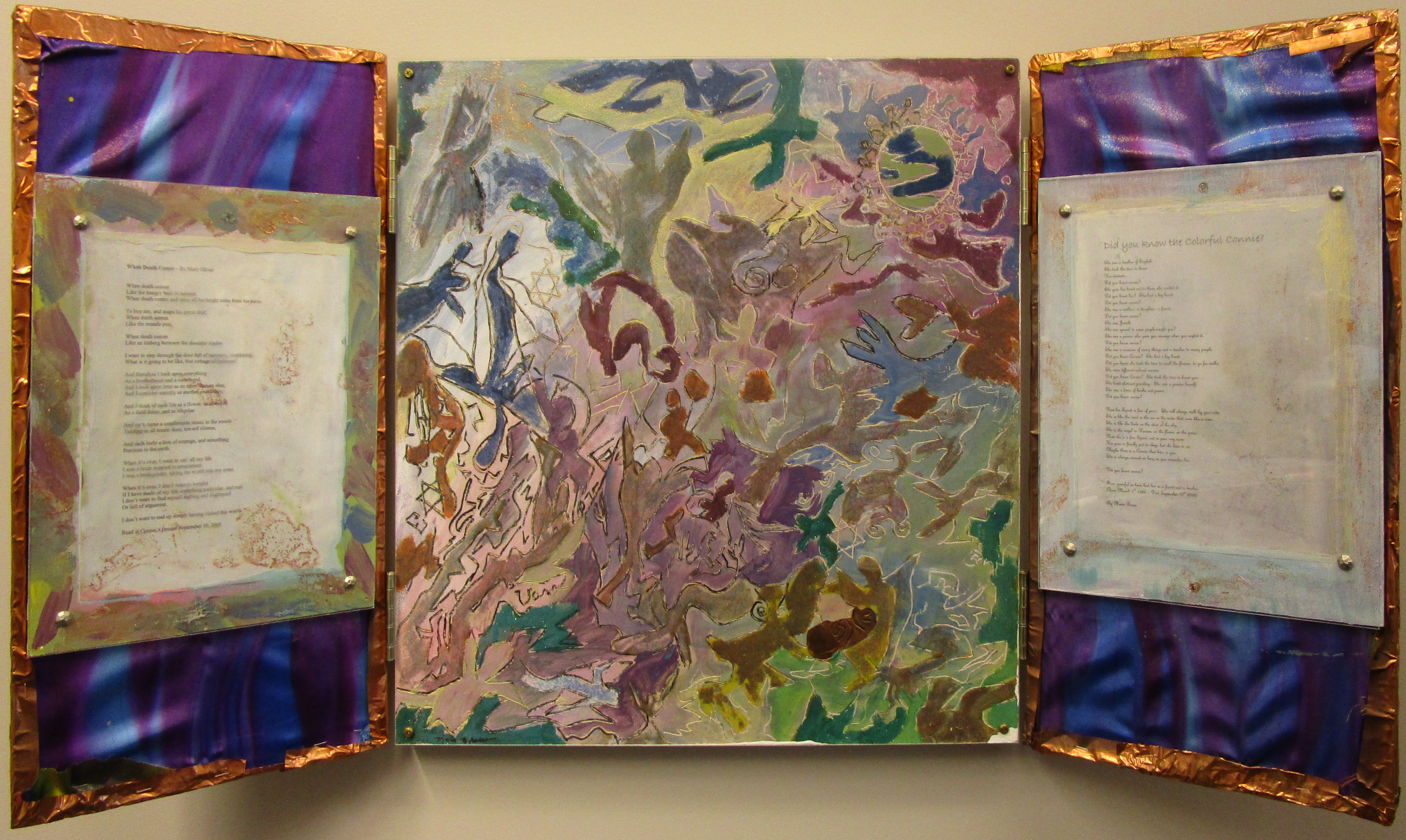 Two poems, with an abstract picture in the center, combined together on a hinged frame which opens like a book