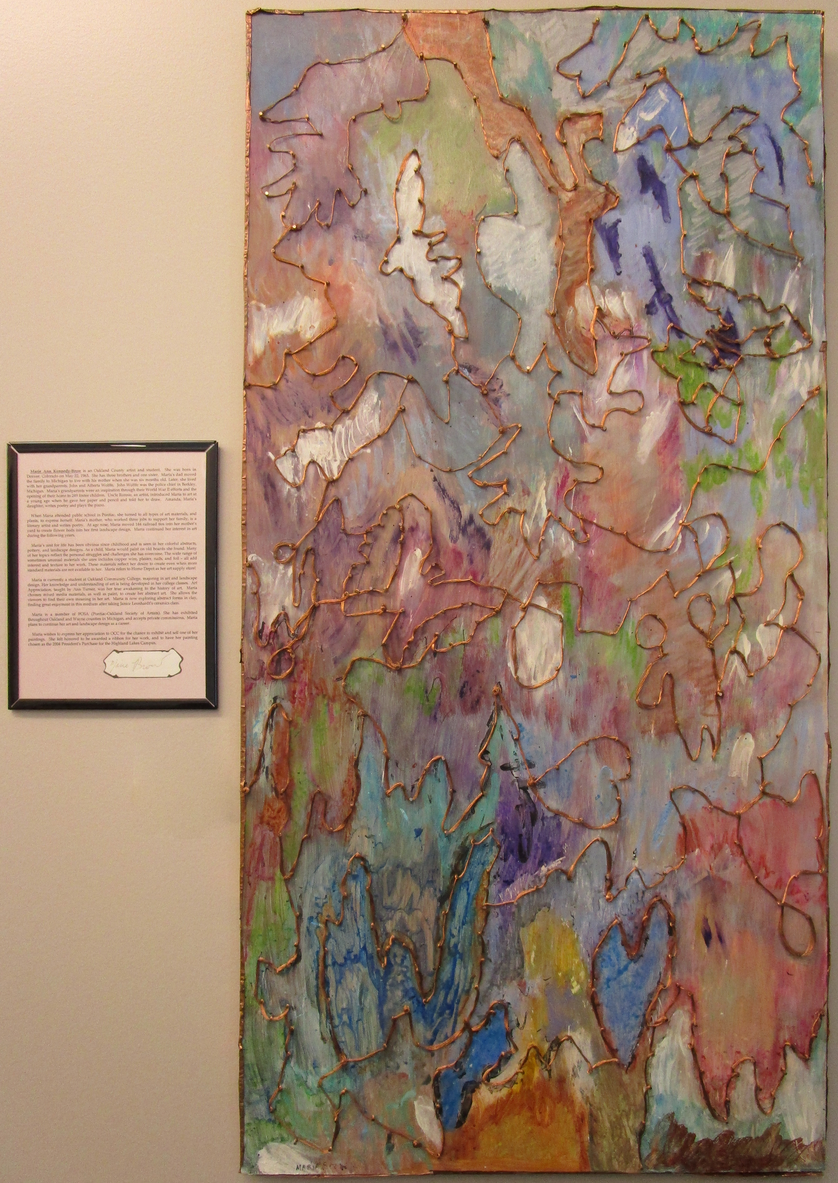 Abstract painting-like-sculpture created with copper wire patterns and copper sheets